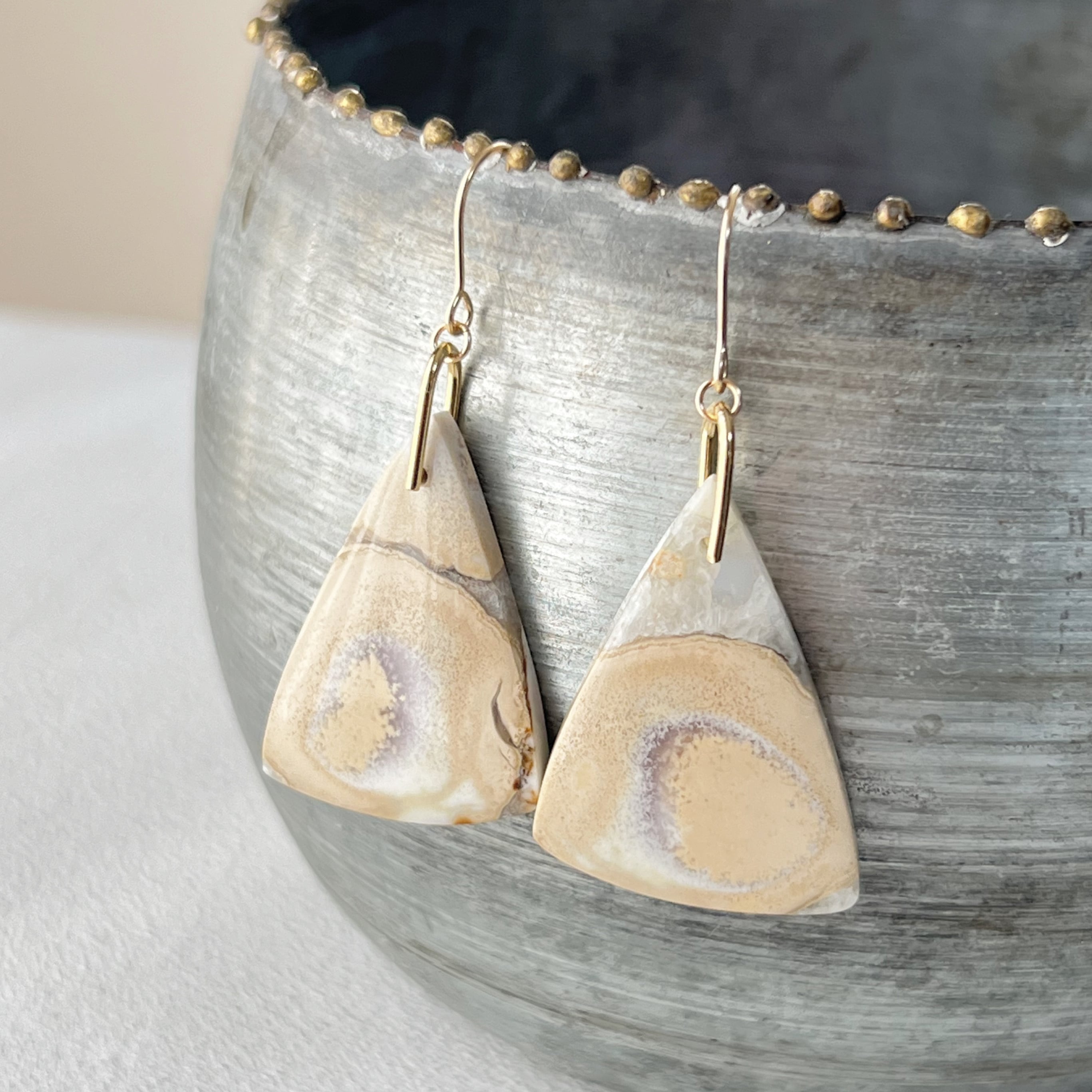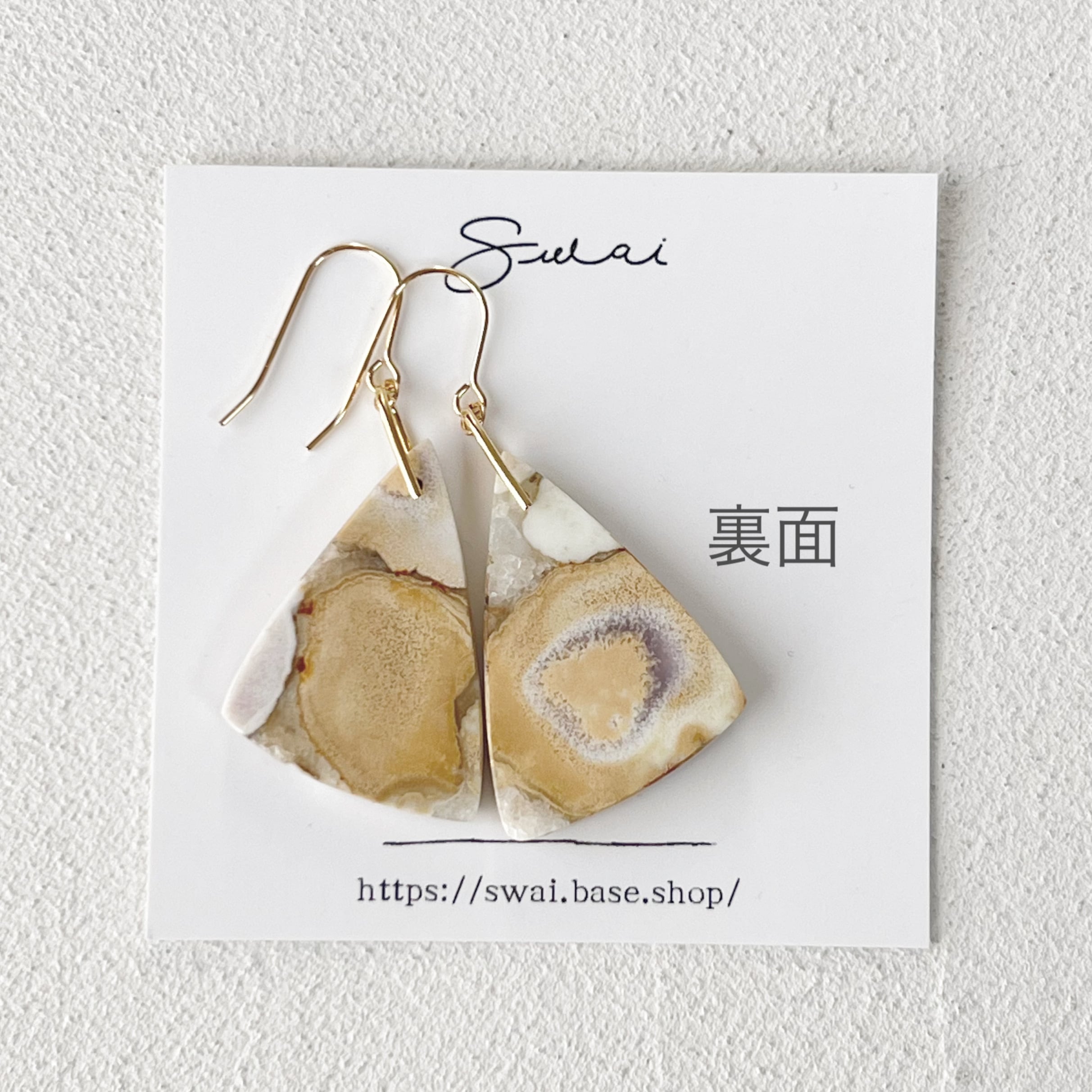 オービキュラーとは円形の意味で、まるい模様が印象的なオービキュラージャスパーのピアスです。ぽっと浮かぶ円模様と、やわらかい温もりあるイエローカラーがナチュラルなピアスです。初めて手に取りましたが想像していたより軽かったです。1点ものです