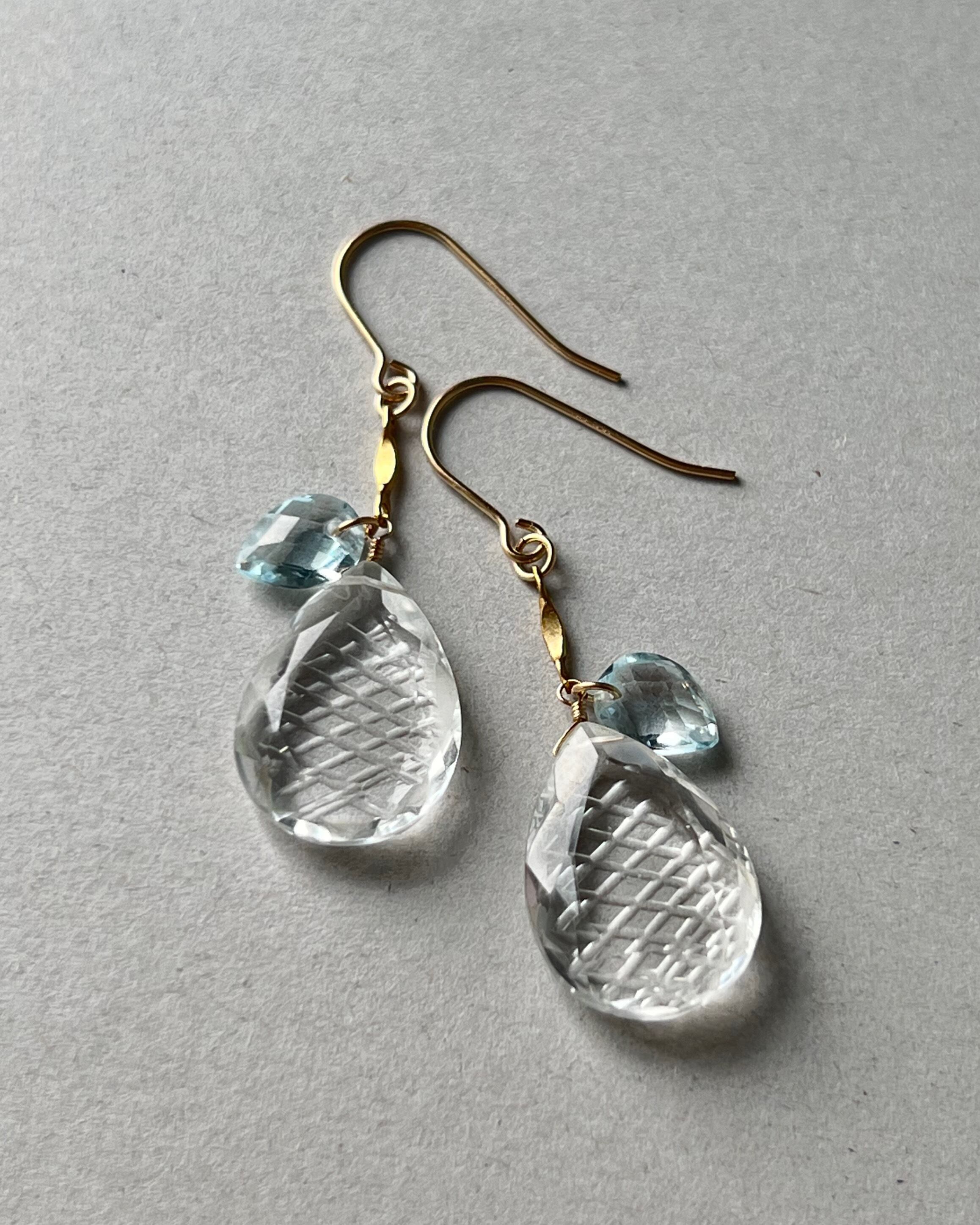 透明感の高い水晶は裏面に格子柄のcarvingが施してあるので光を受けてよく煌めきます。