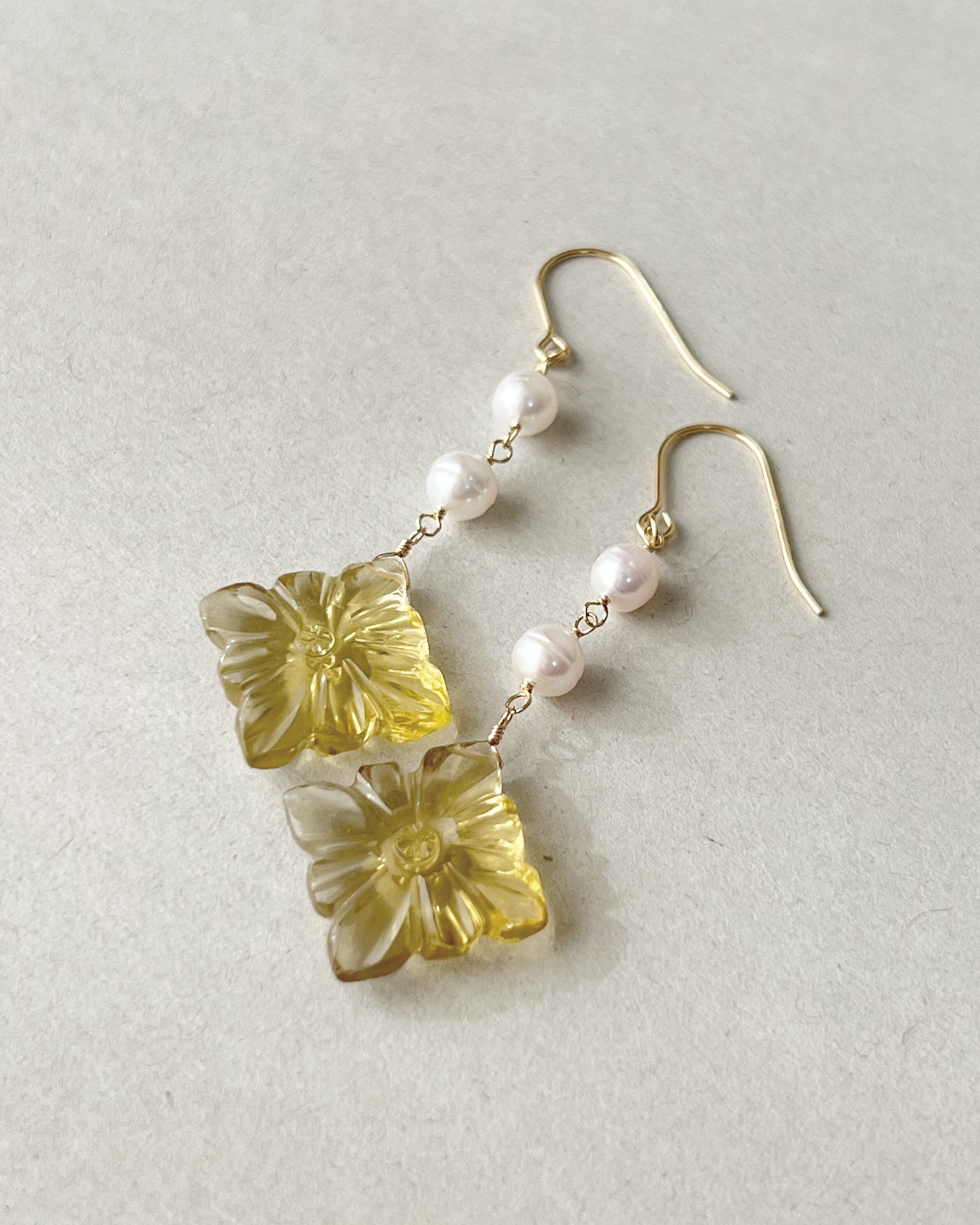 淡いイエローのハニークォーツの両面フラワーcarvingに、サークル入りの淡水パールを繋げ華やかに仕上げました。可愛らしい印象です。1点ものです。