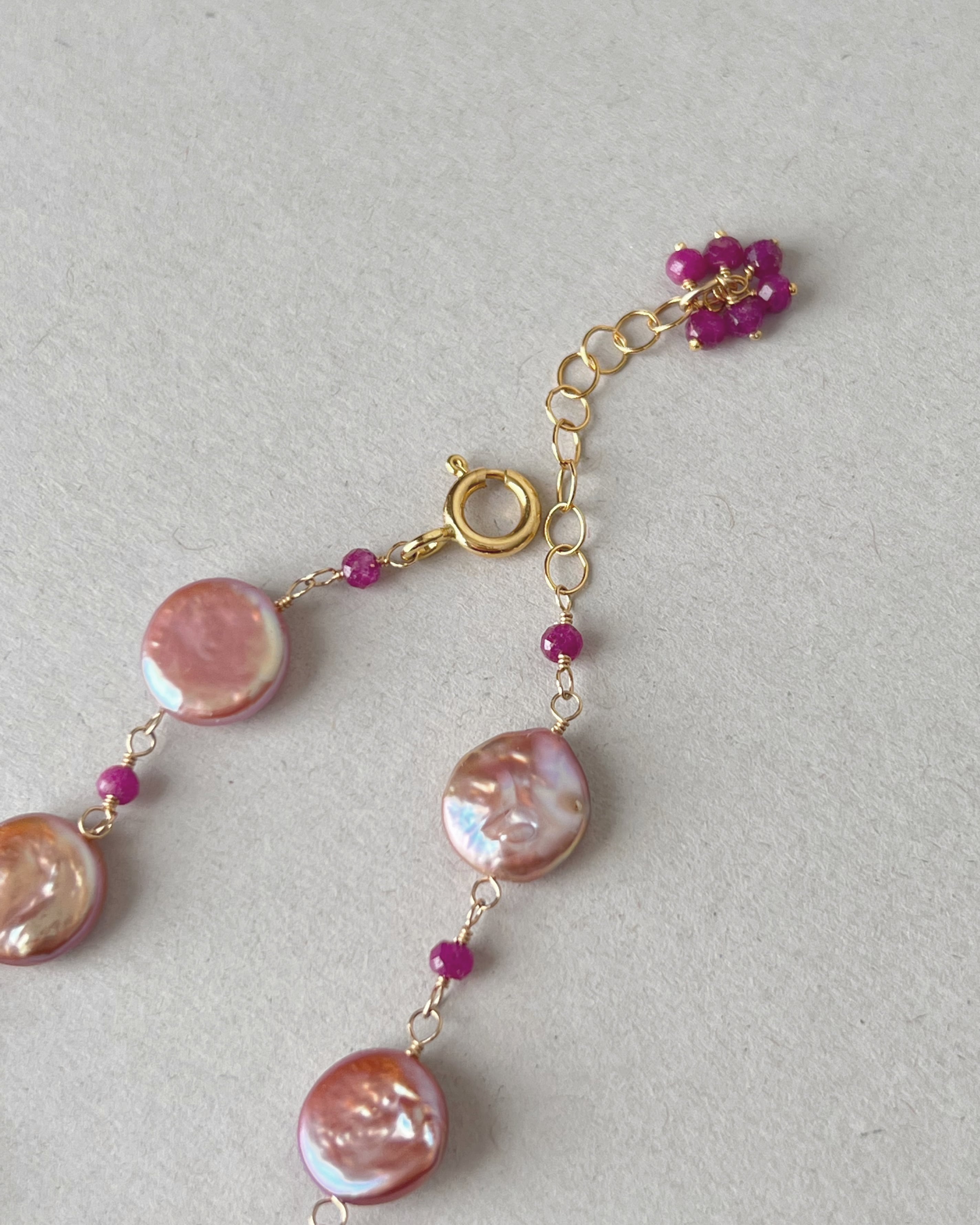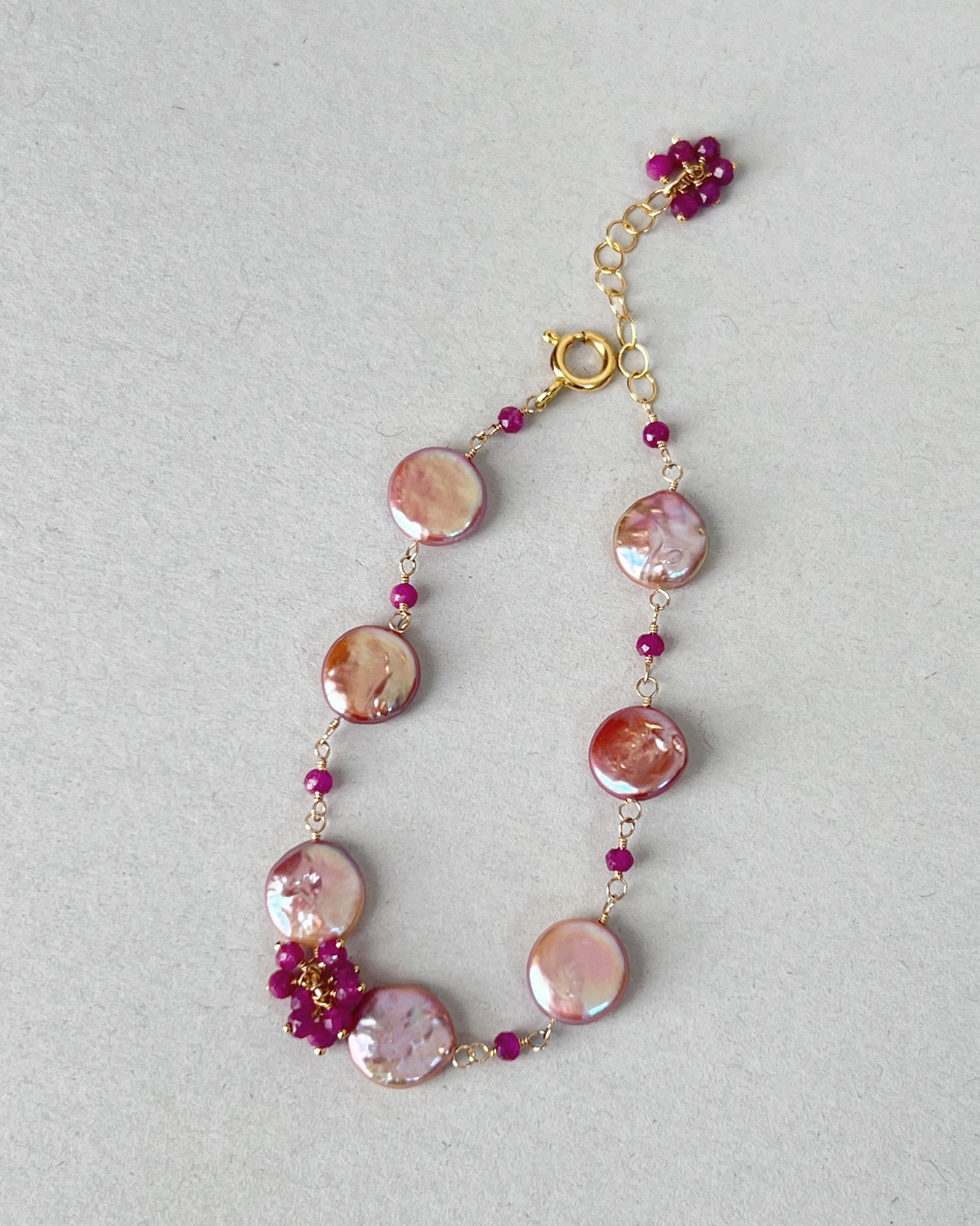 自然色のやさしく艶めくナチュラルピンクの淡水コインパールをメインに繋げルビーのポイントをアクセントに飾ったデザインブレスレットです。