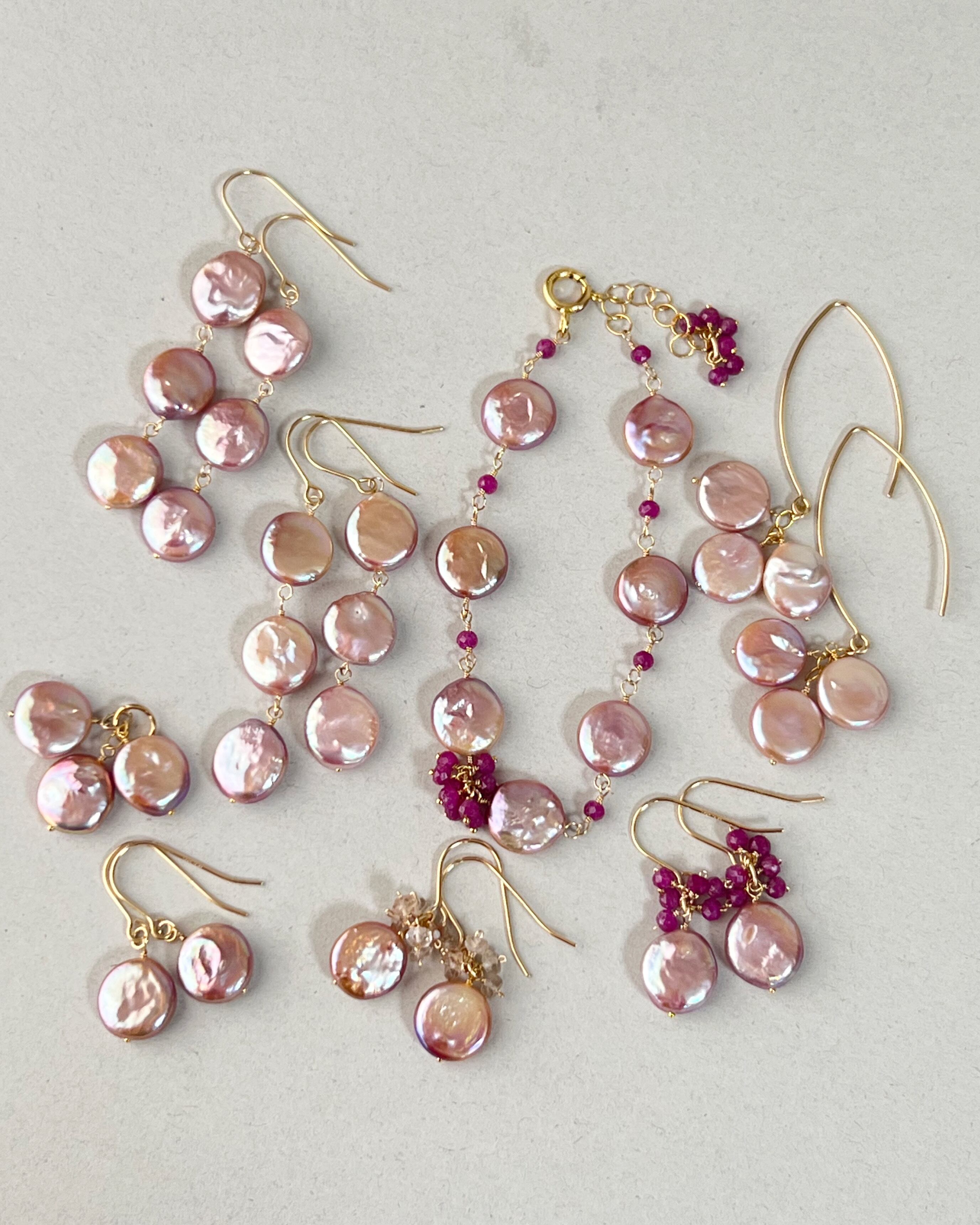 コインパールは一粒一粒異なる表情を持ち、光の当たり方でピンク〜パープル、中にはゴールドの照りが浮かびます。