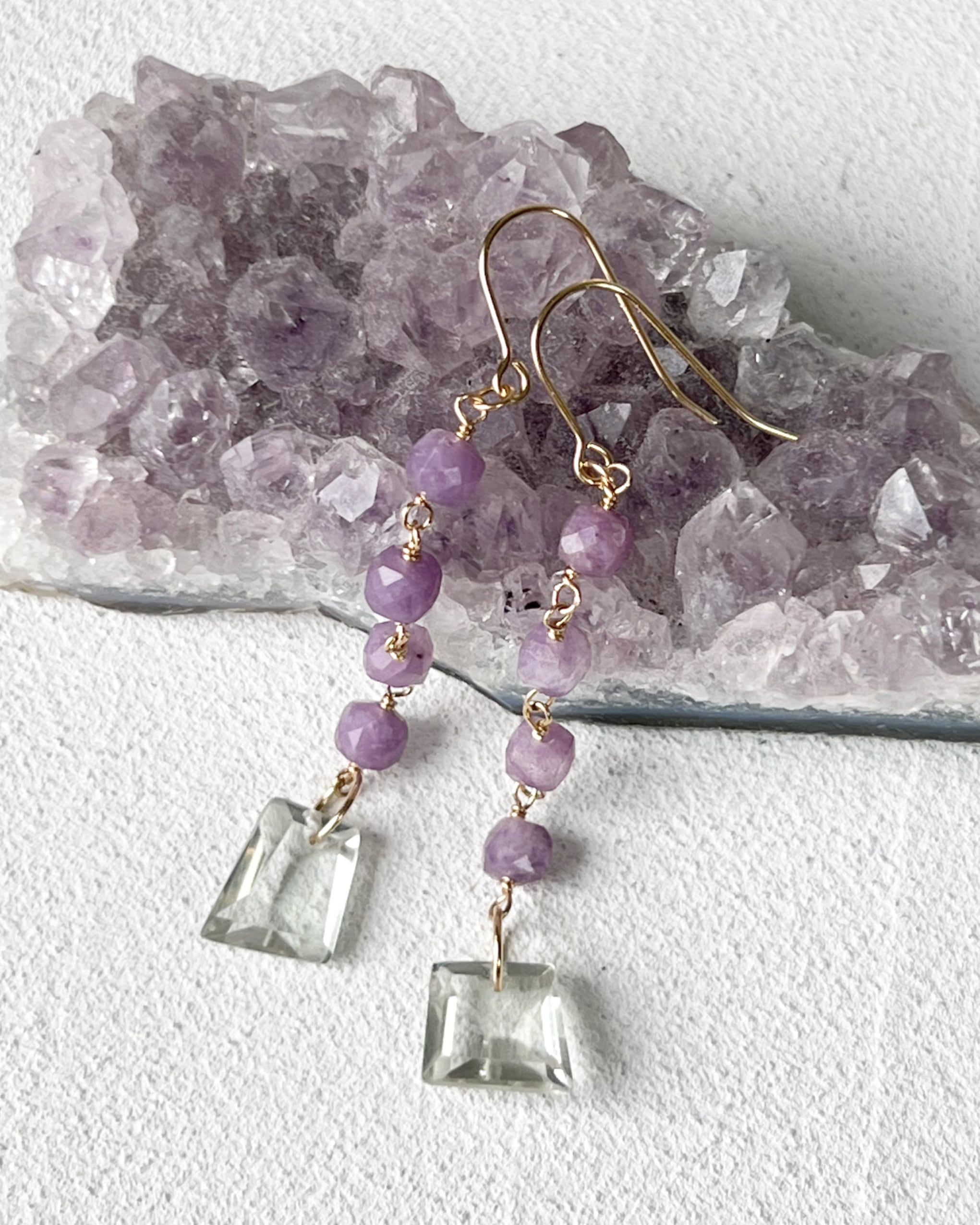 キューブカットのレピドライトの落ち着いた紫色が縦のラインを強調します。先端に透明感の高いシャープなカットのグリーンアメジストが煌めくロングピアスです。