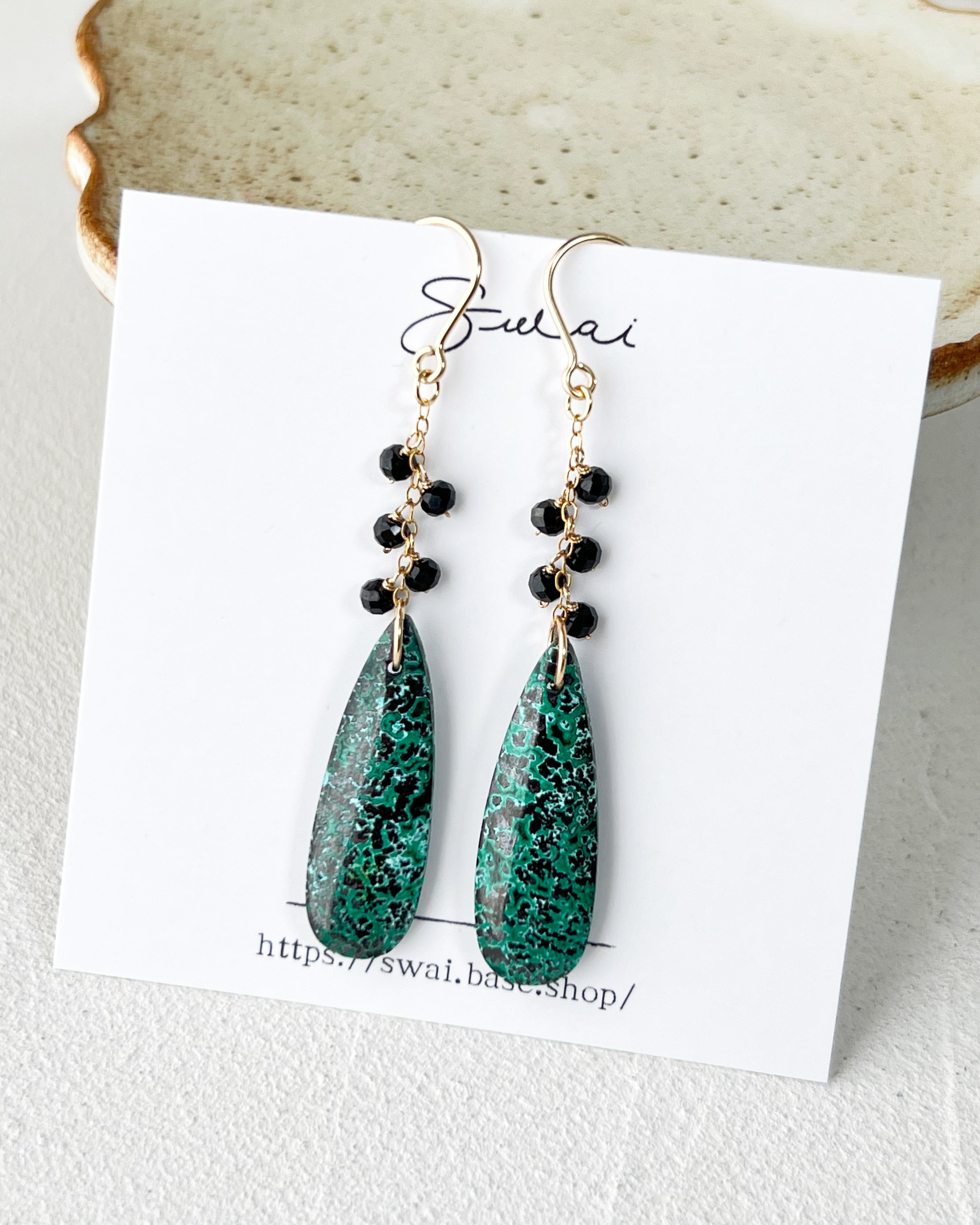 グリーンとブラックの細かい複雑なパターン模様のクリソコラを使用したピアスです。