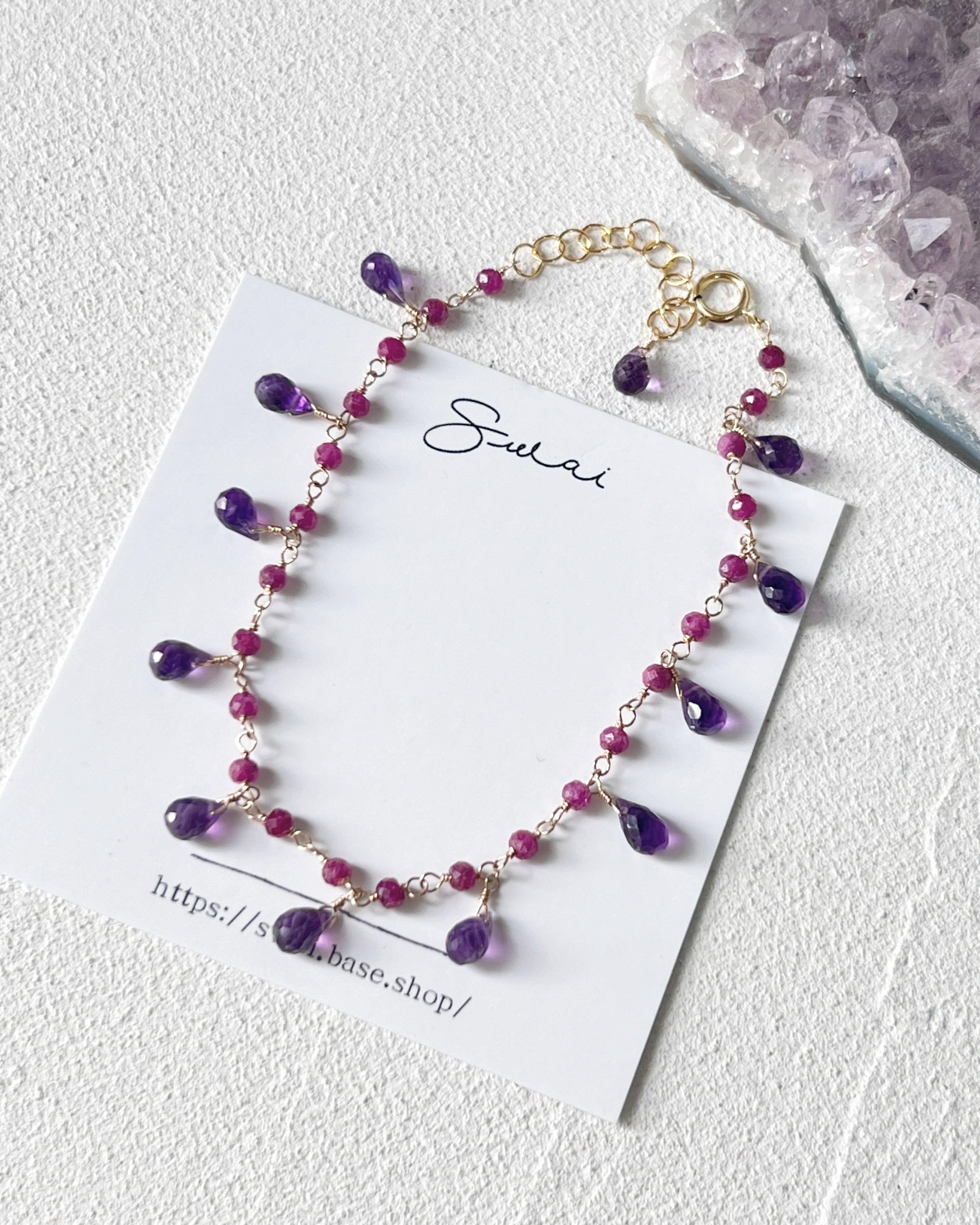 ナチュラルルビーに小さなアメジストのドロップカットを一周フリンジのように飾ったブレスレットです。