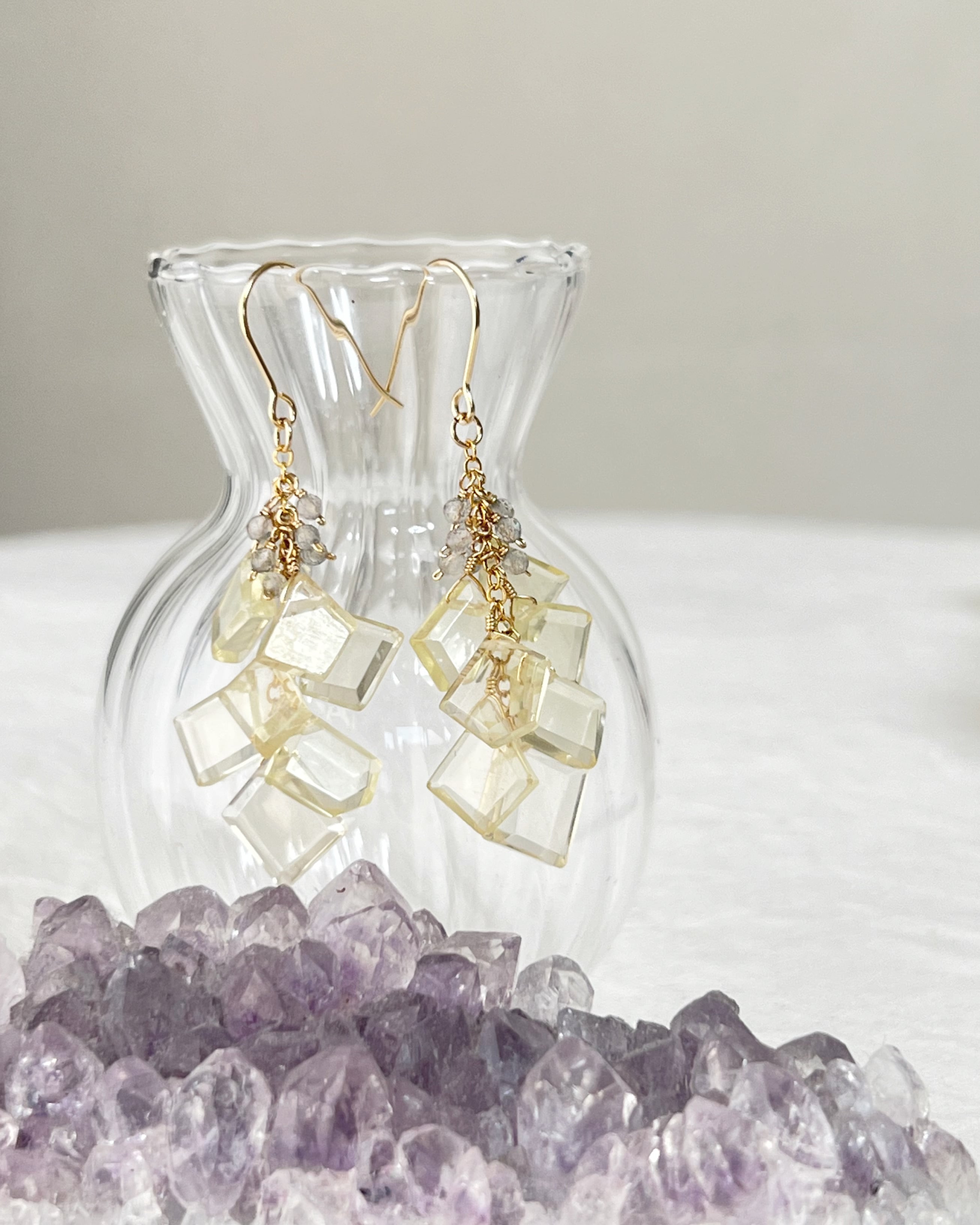 主張しすぎないレモンカラーと透明感がとても爽やかです。小粒のラブラドライトを添えて繊細な煌めきをプラスしました。甘すぎず大人っぽく着けていただけます。