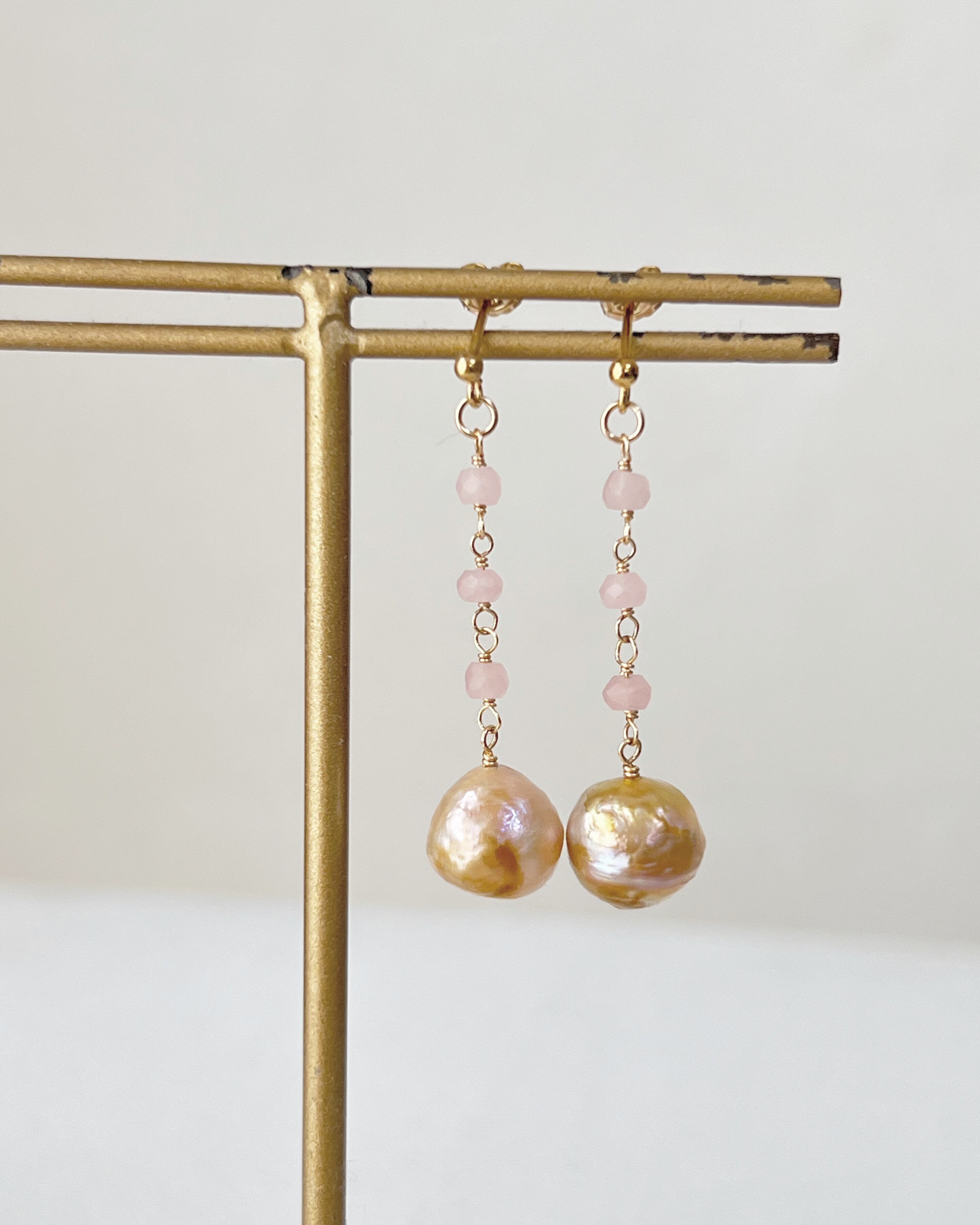 一粒ごとに異なる表情のナチュラルカラーの淡水バロックパールに、柔らかなピンクカラーのグァバクォーツを繋げたセミロングピアスです。