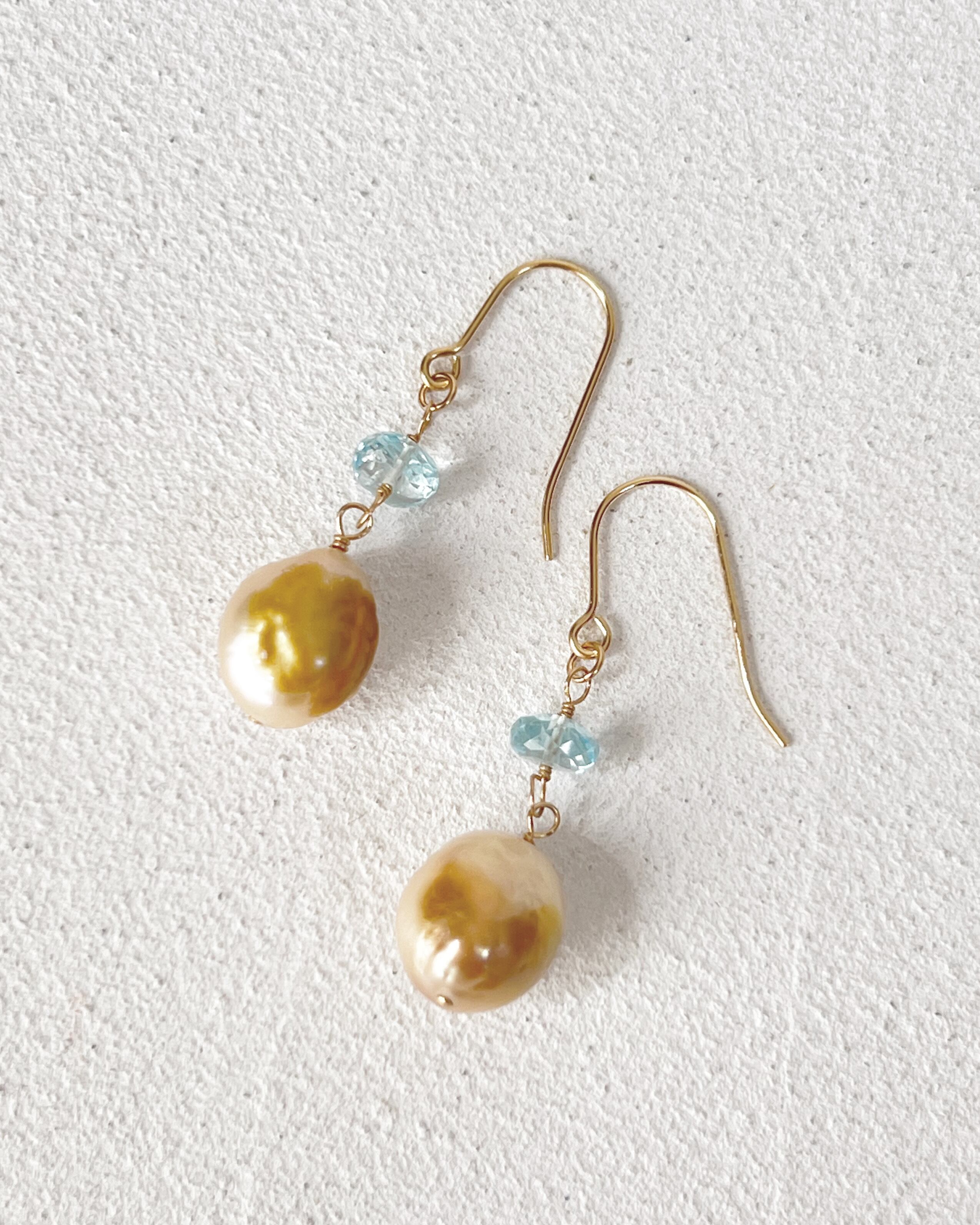 一粒ごとに異なる表情のナチュラルカラーの淡水バロックパールに、涼しげに輝くブルートパーズを合わせました。
