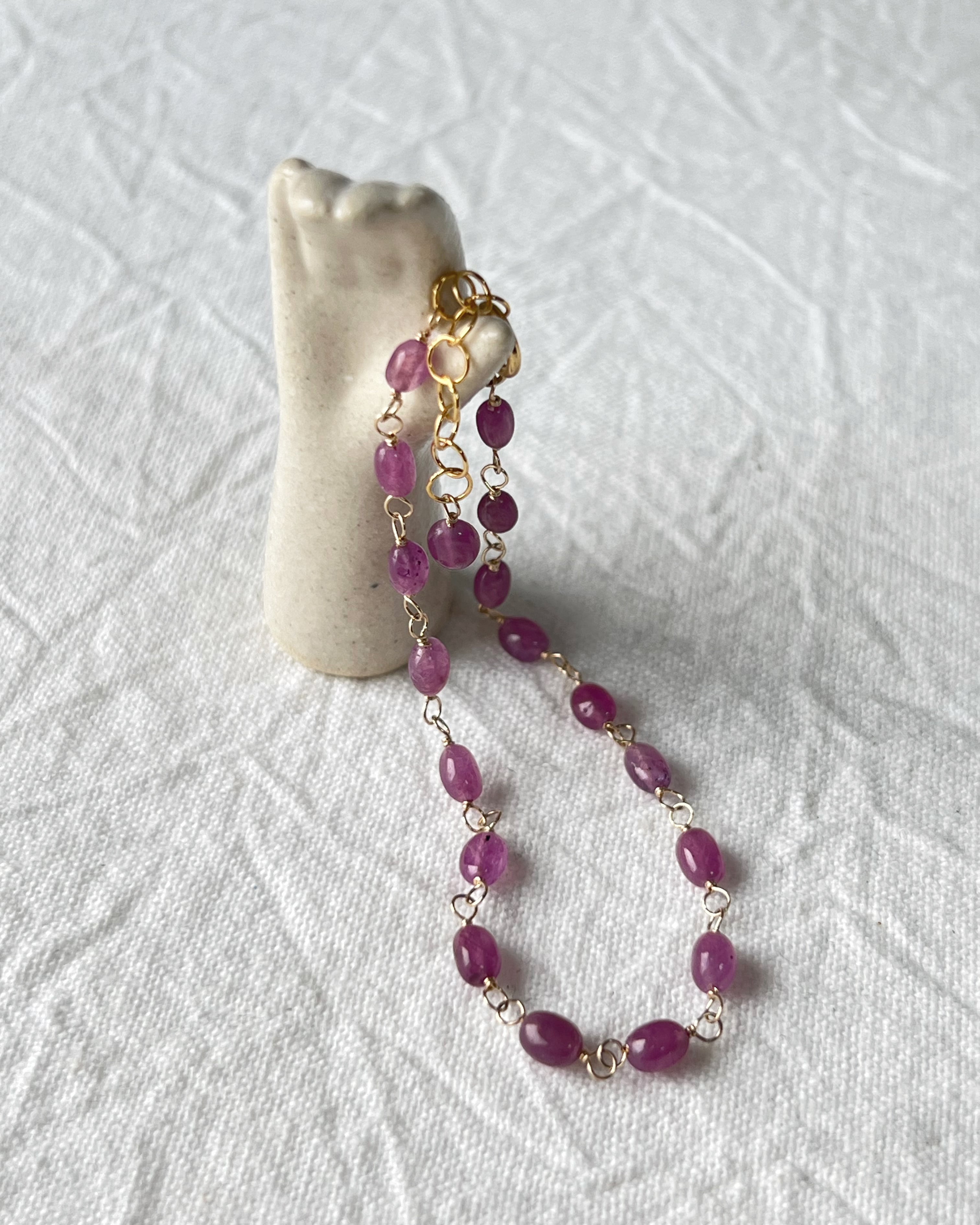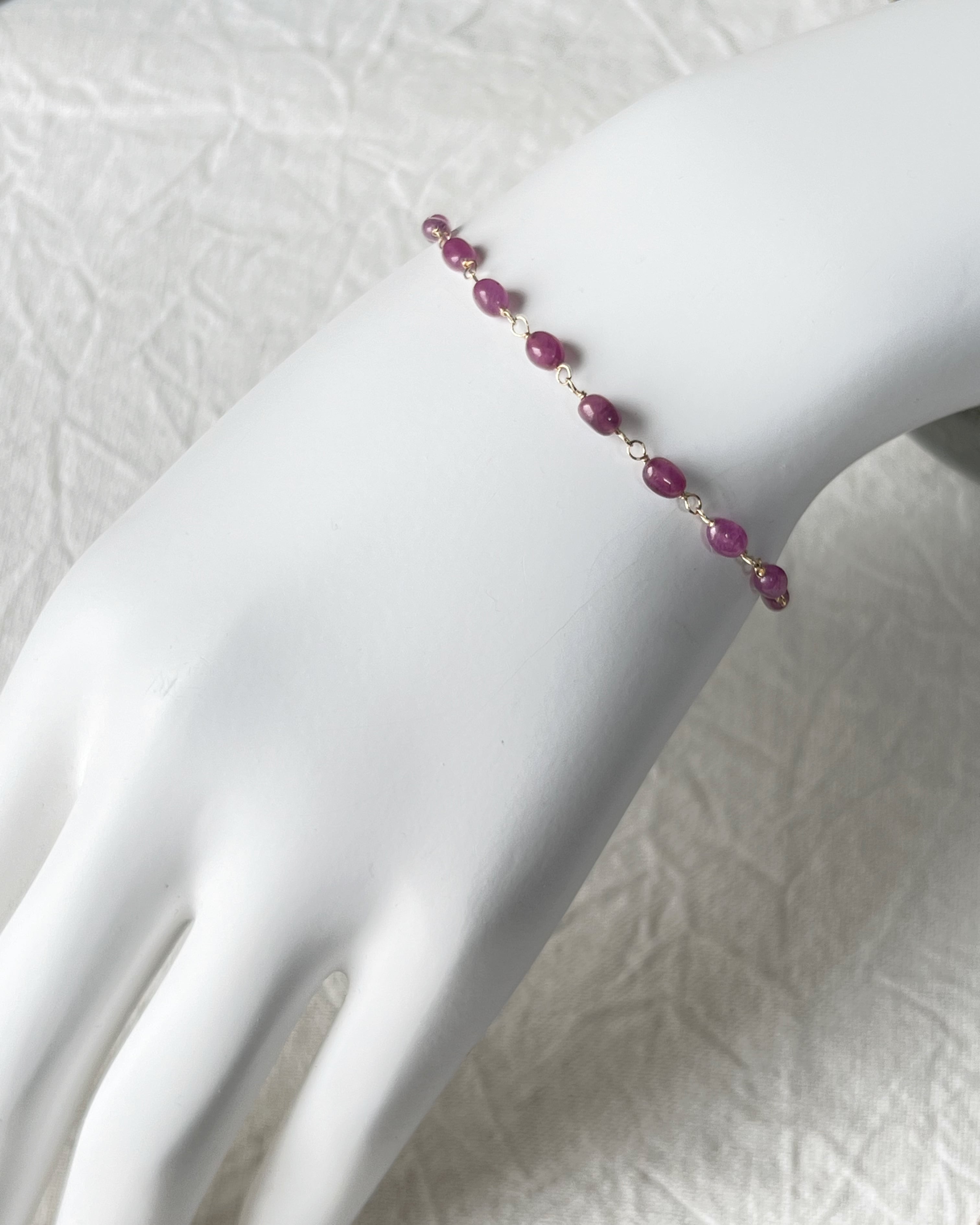 小さなルビーのスムースタンブルを14kgfワイヤーで繋いだブレスレットです。