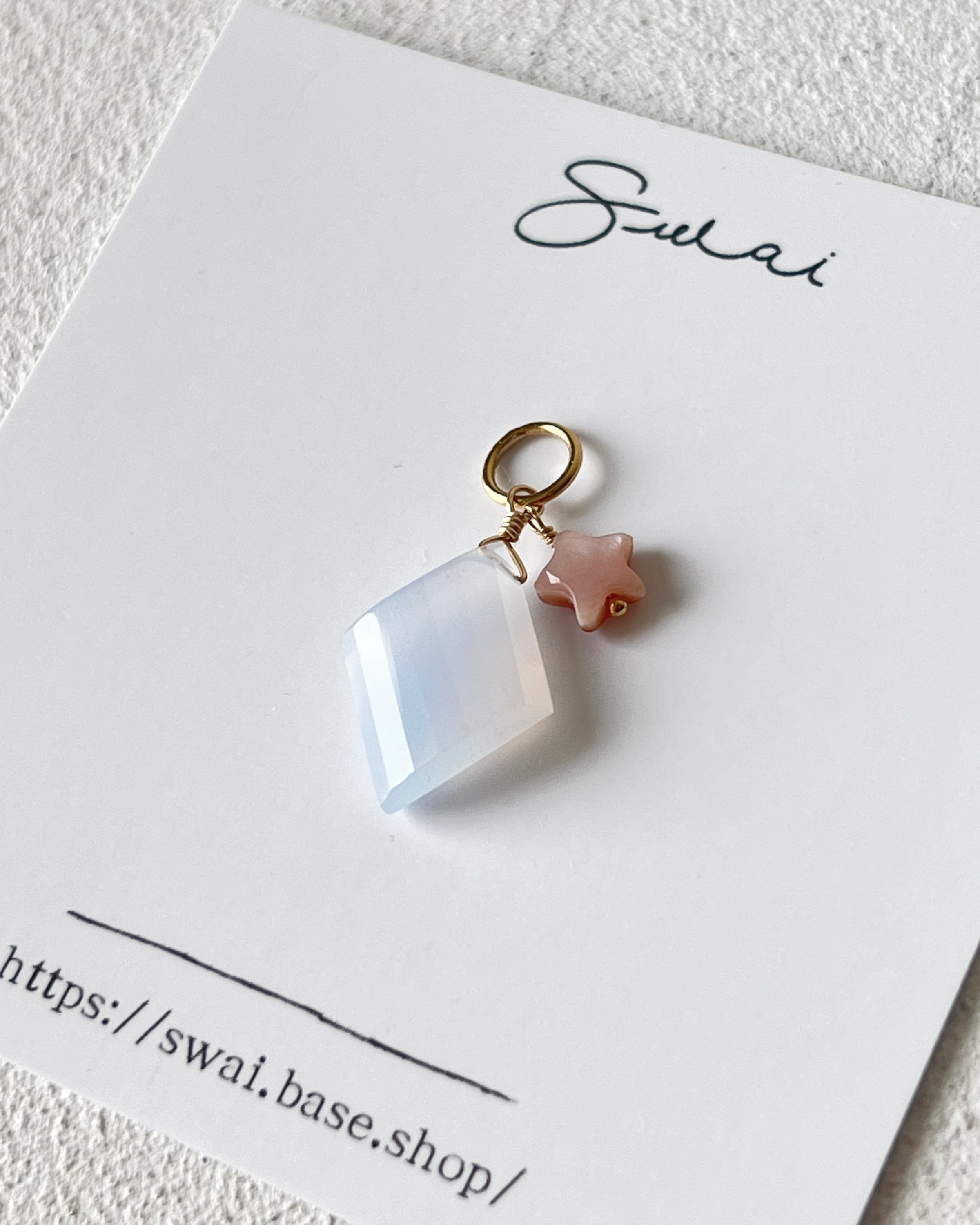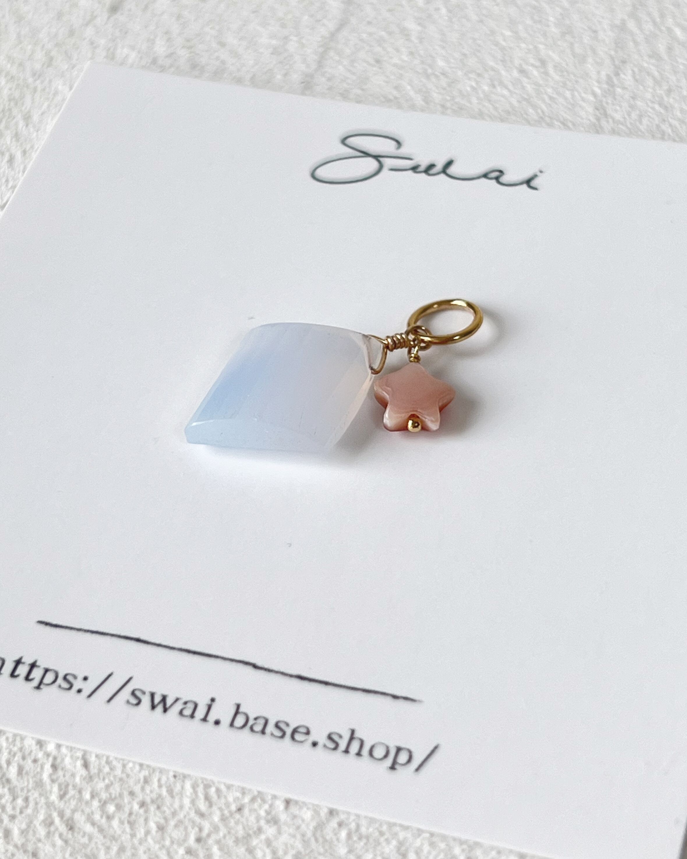 ナチュラルブルーカルセドニーにピンクシェル(自然色)の星カットをさげたペンダントトップ。