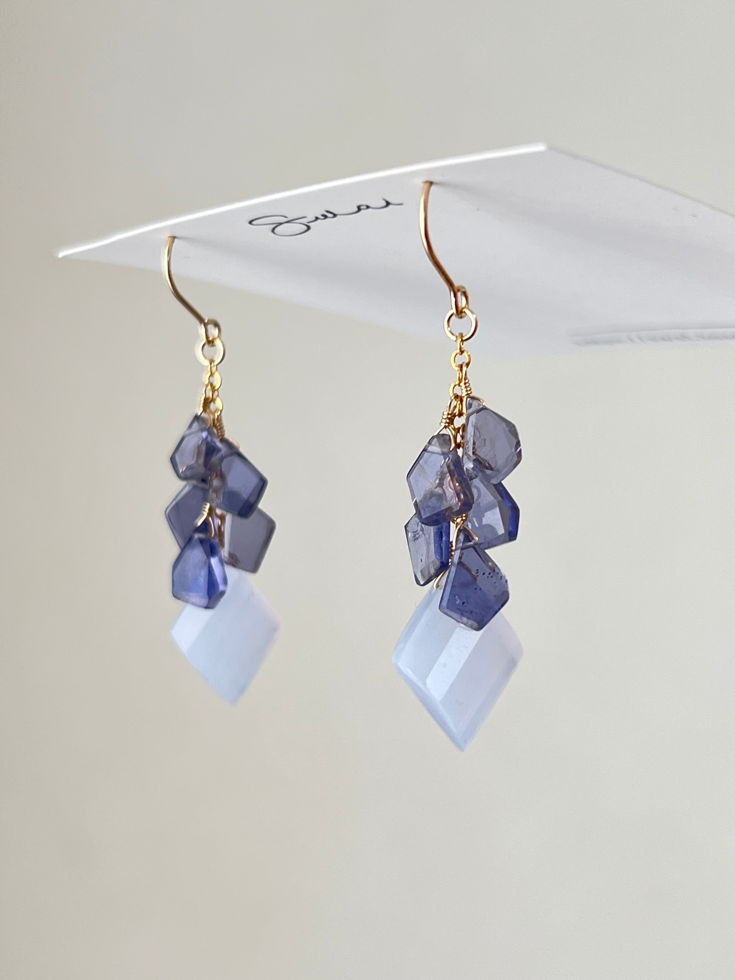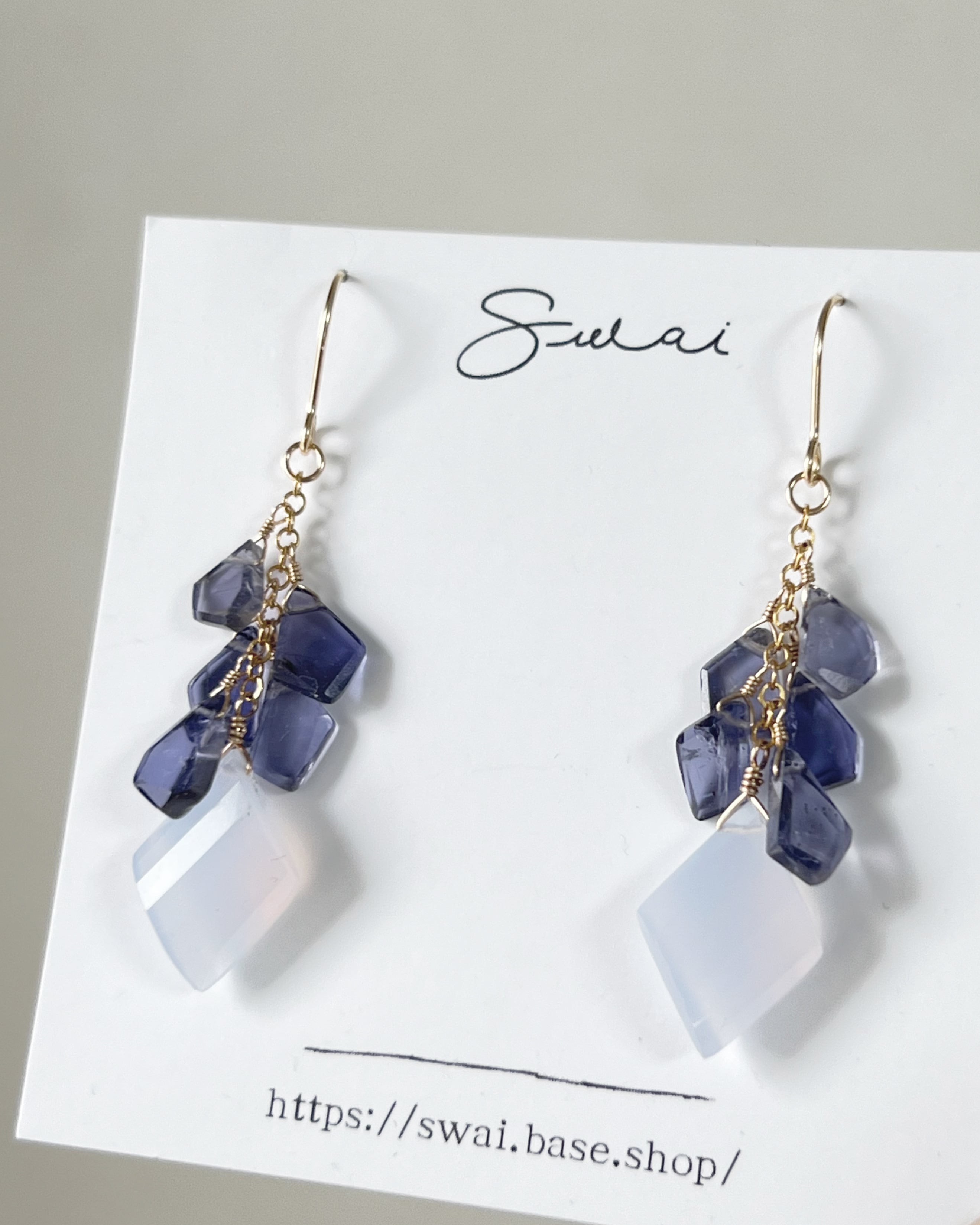 ブルーカルセドニーの表面にはカットが入っています。アイオライトのスライスカットの透明感が引き立つしゃらしゃらピアスです。