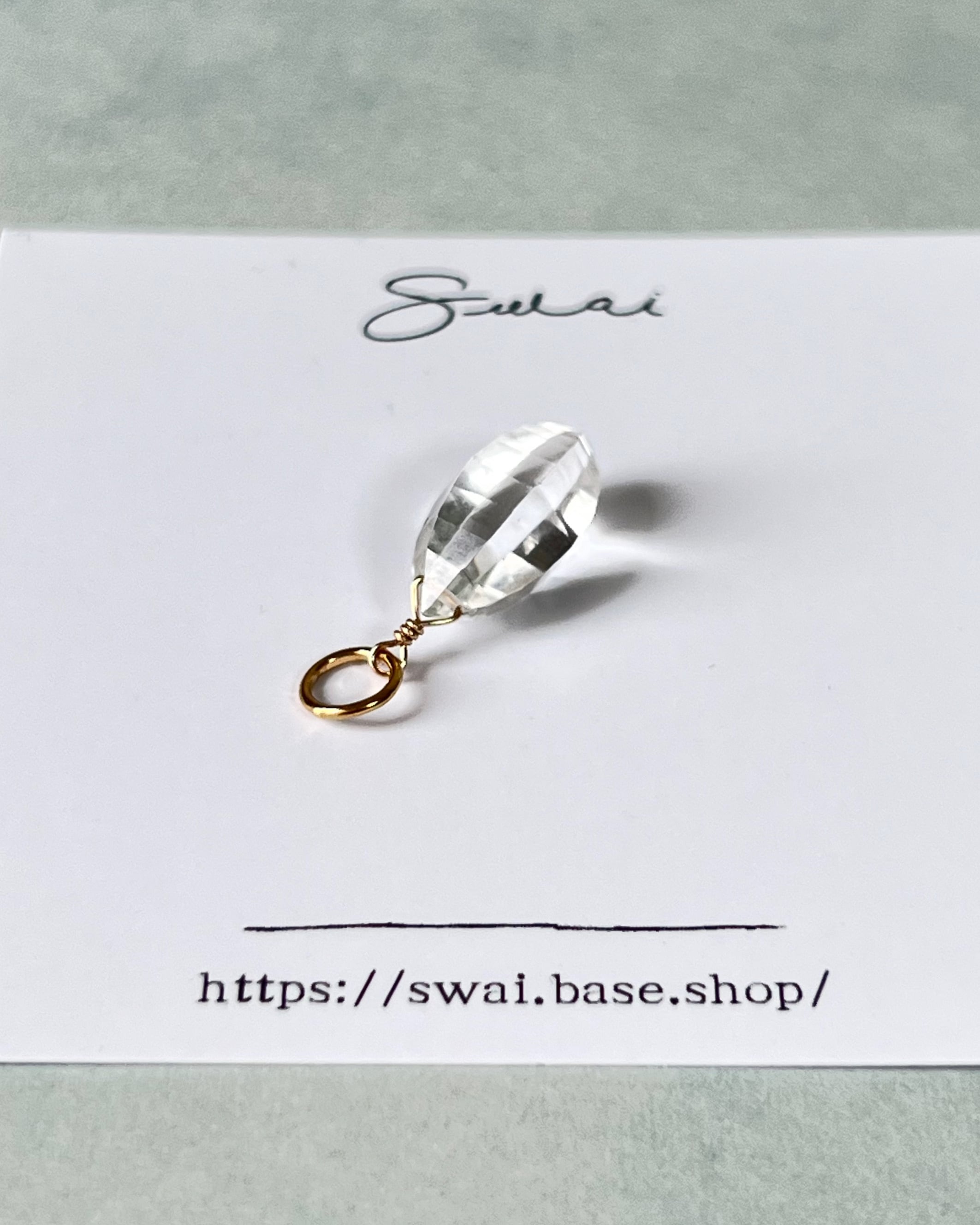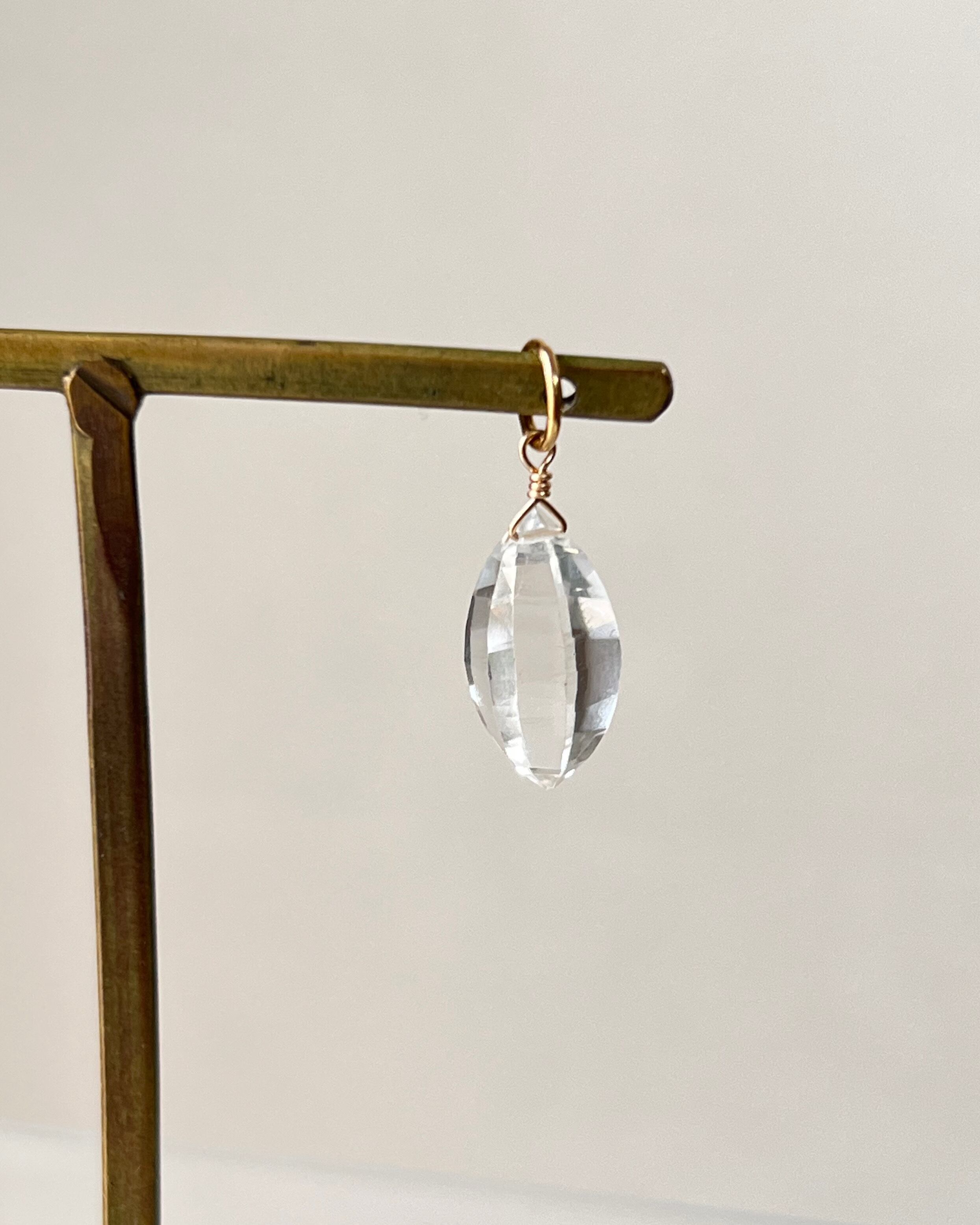 こちらはふっくらしたマーキスのようなフォルムで縦に6面カットになっているのでシャープな印象です。表面にもカットが入っていて透明度も高い水晶です。