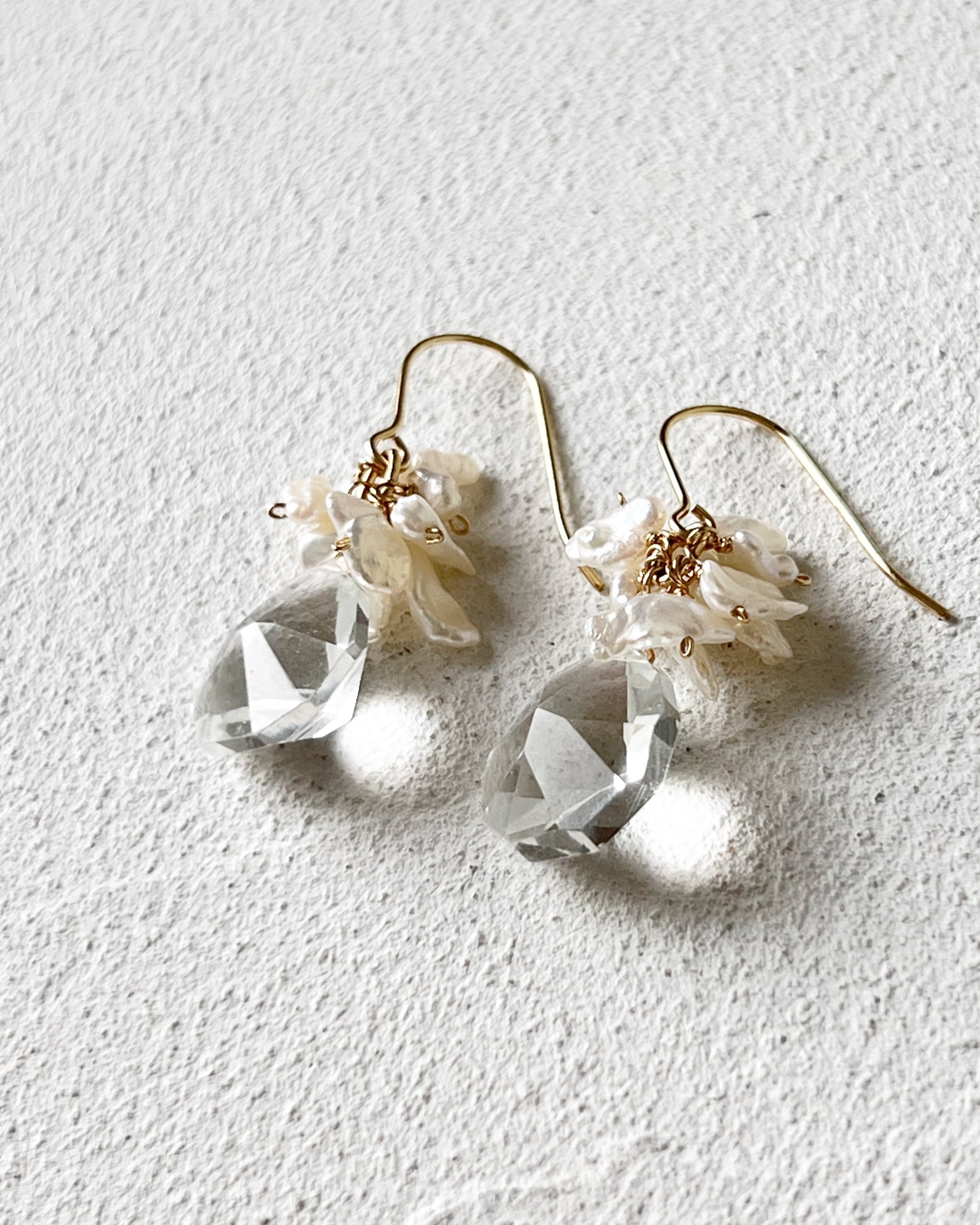 無核のヒラヒラとした淡水パールをあわせました。ラフで自然体な美しさがあります。かしこまりすぎない抜け感のあるピアスです。