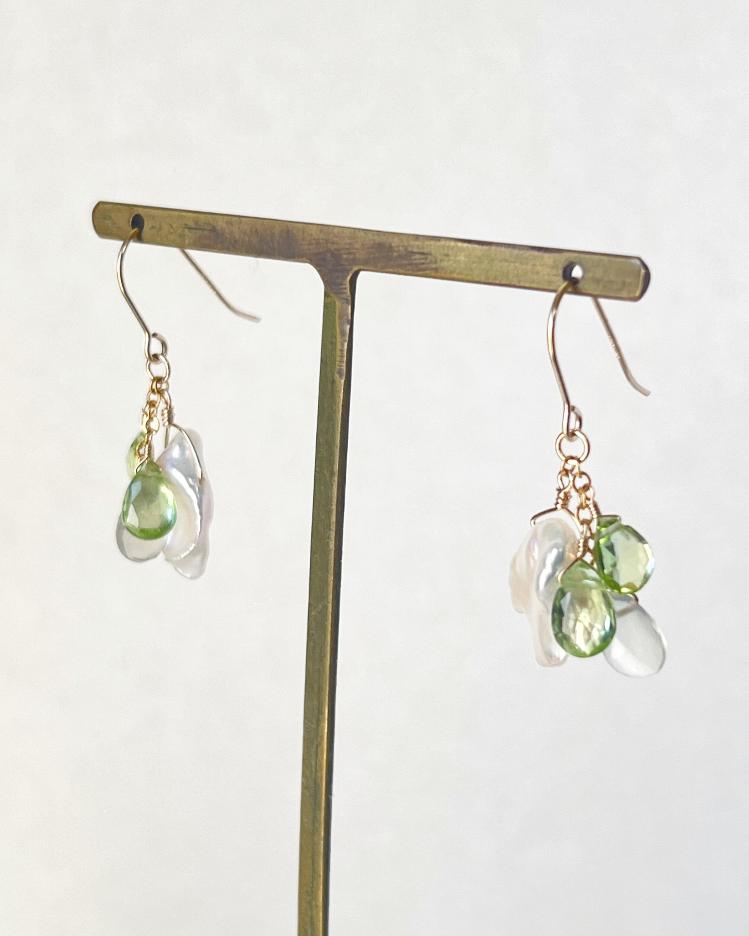 花びらのような淡水パールに、ペリドットの爽やかな彩りを添えたショートピアスです。
