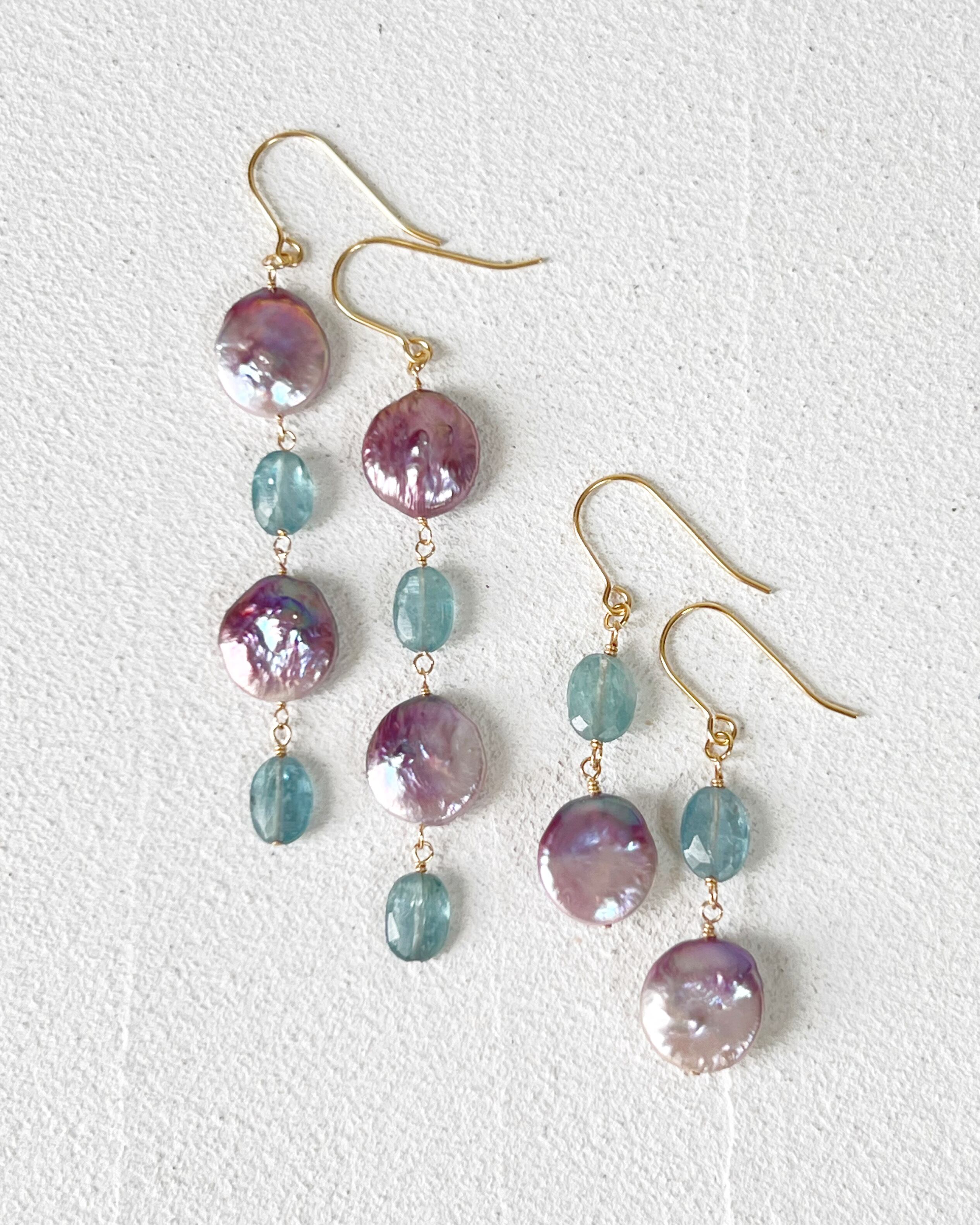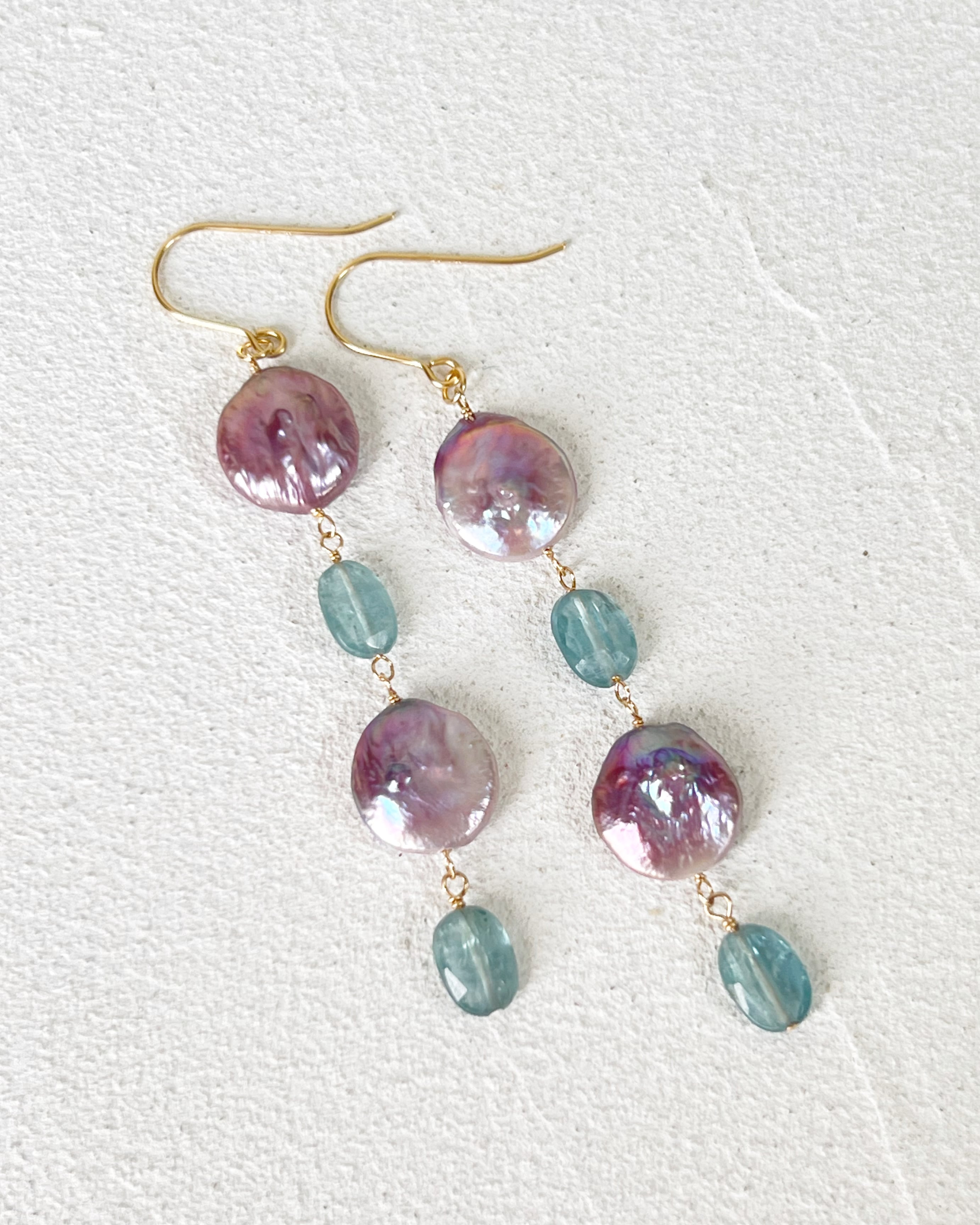 パープル淡水パール×アクアカイヤナイトロングピアス