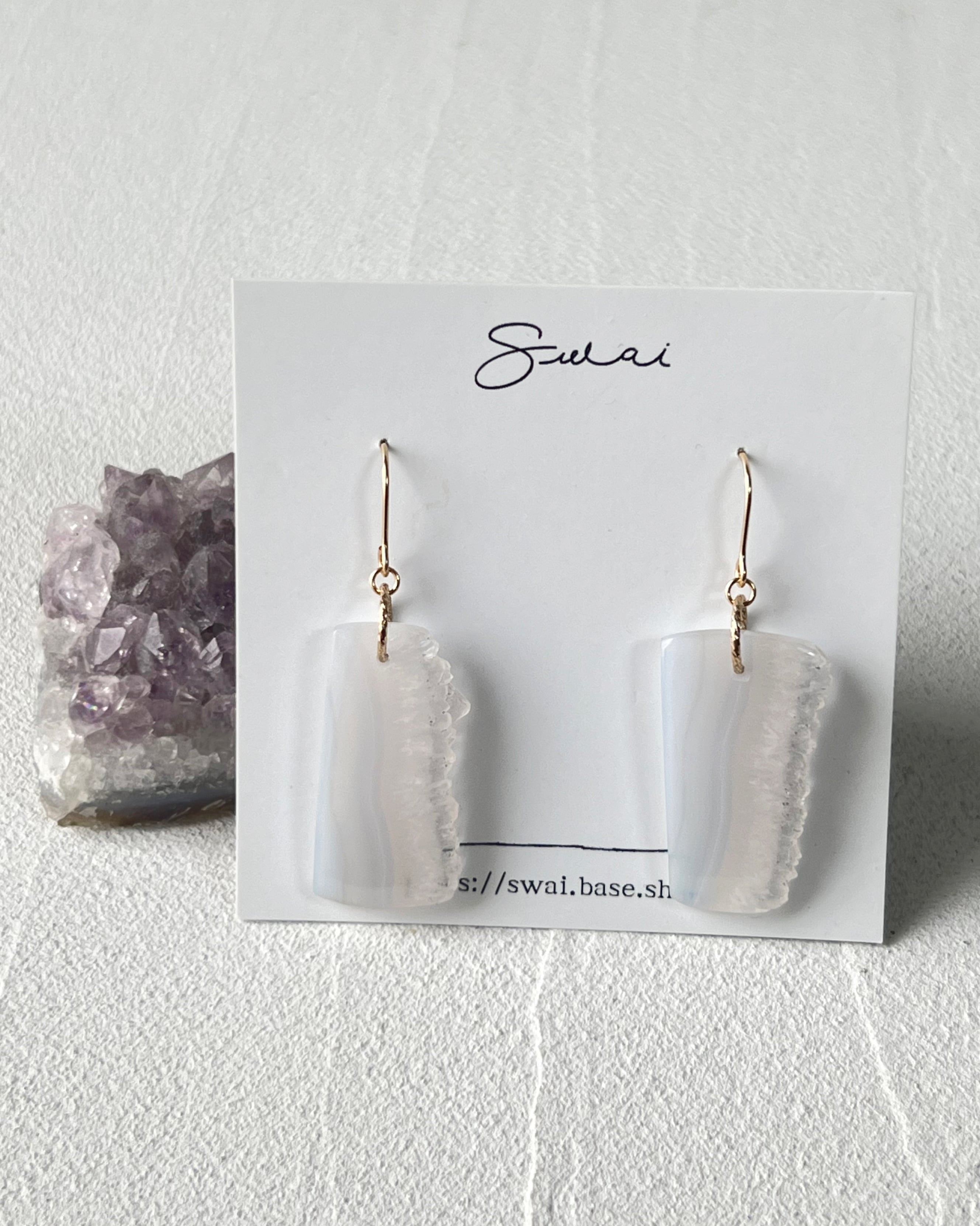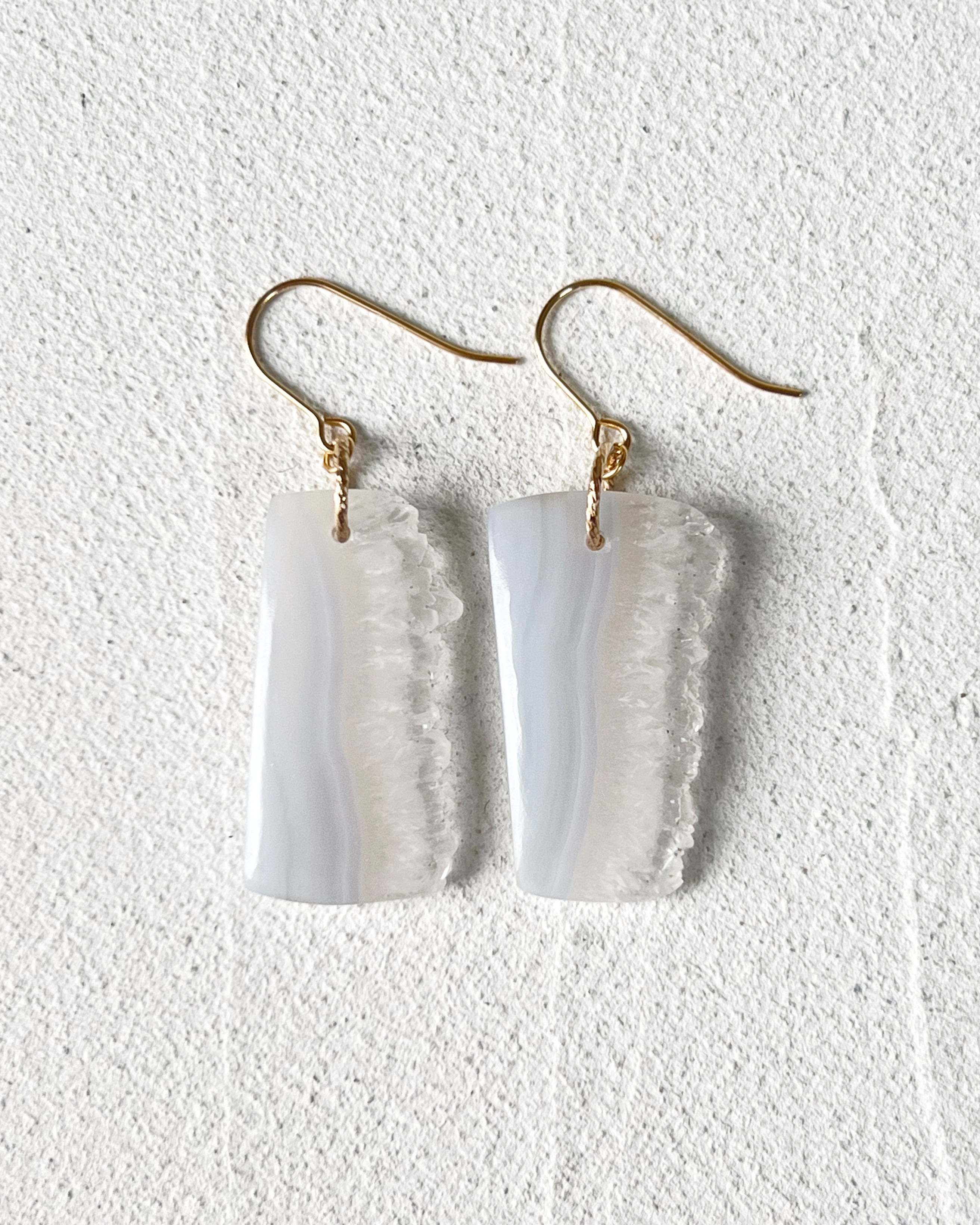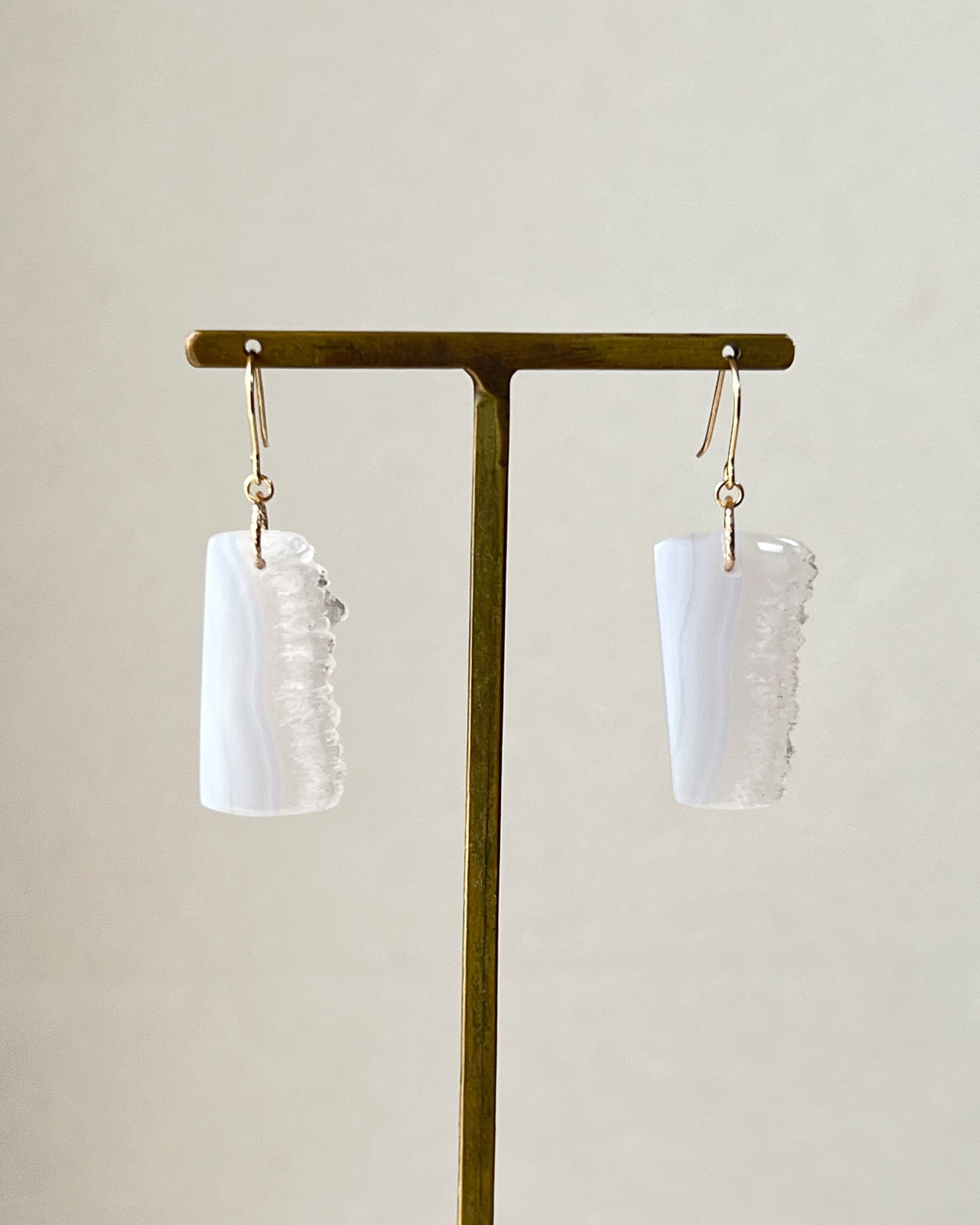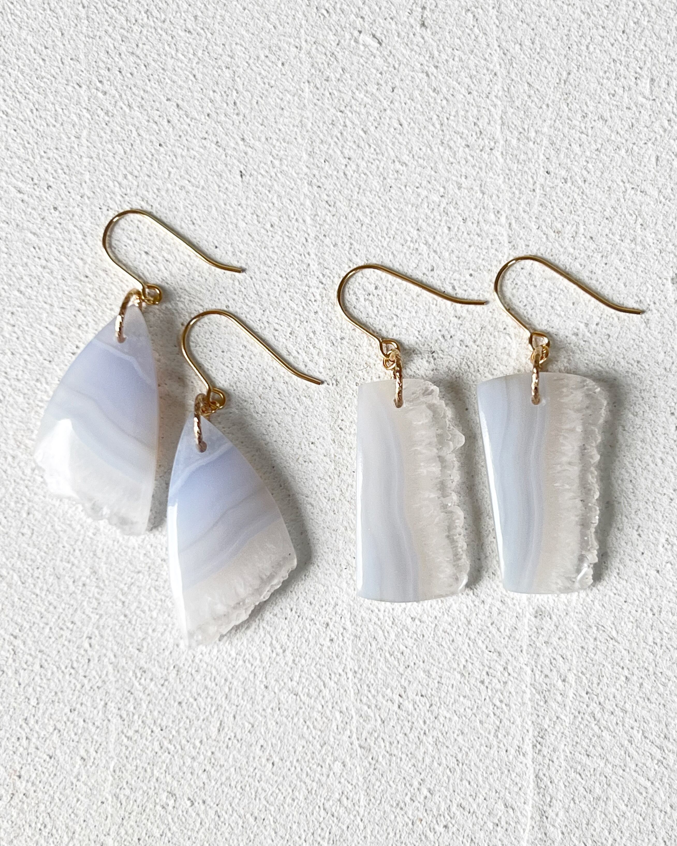 今回のピアスのようなブルーレースアゲートの場合は、縞模様の部分とドゥルージーの結晶の部分が一緒に楽しめるのが魅力です。
