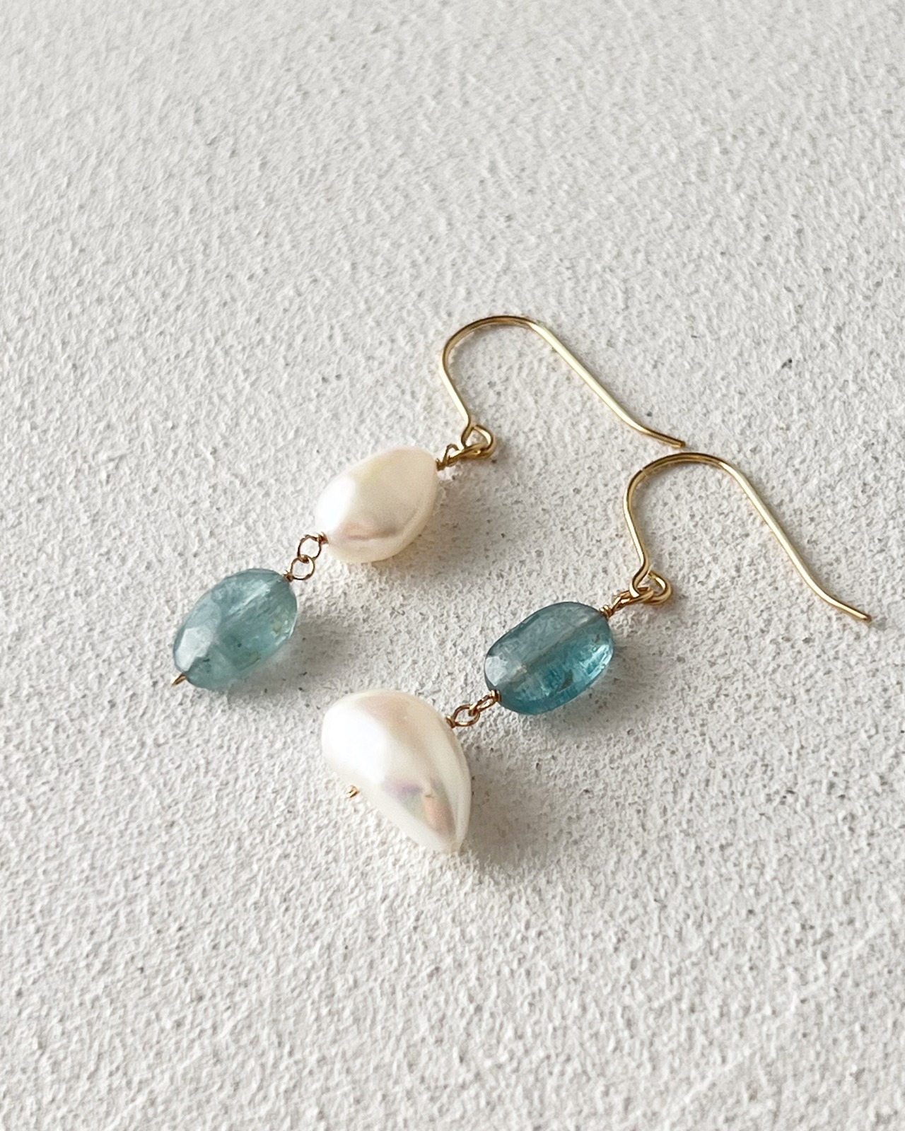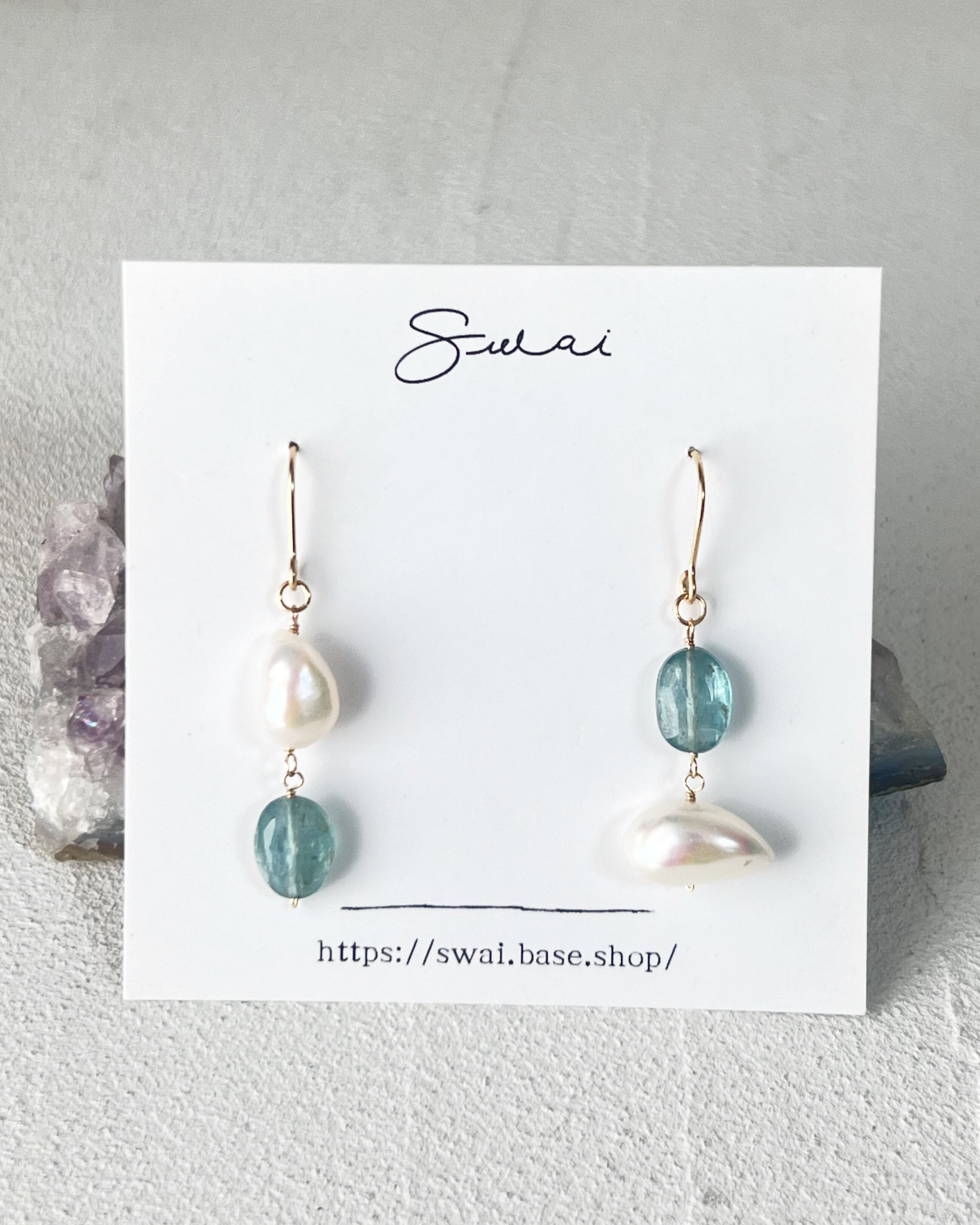 個性ある淡水パールを使用したアシンメトリーピアスです。先端が細長くなっていてユニークな形です。美しいアクアカイヤナイトが爽やかに輝きます。