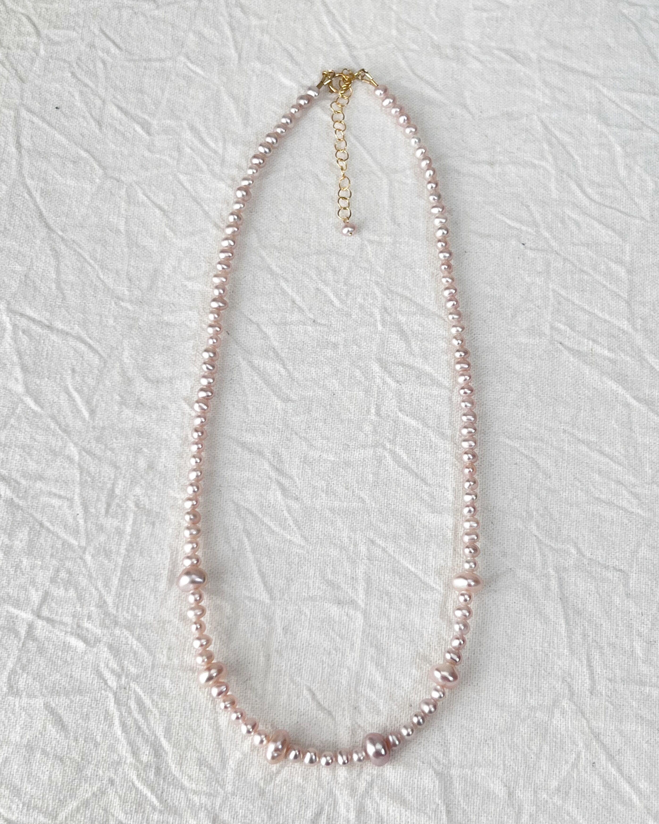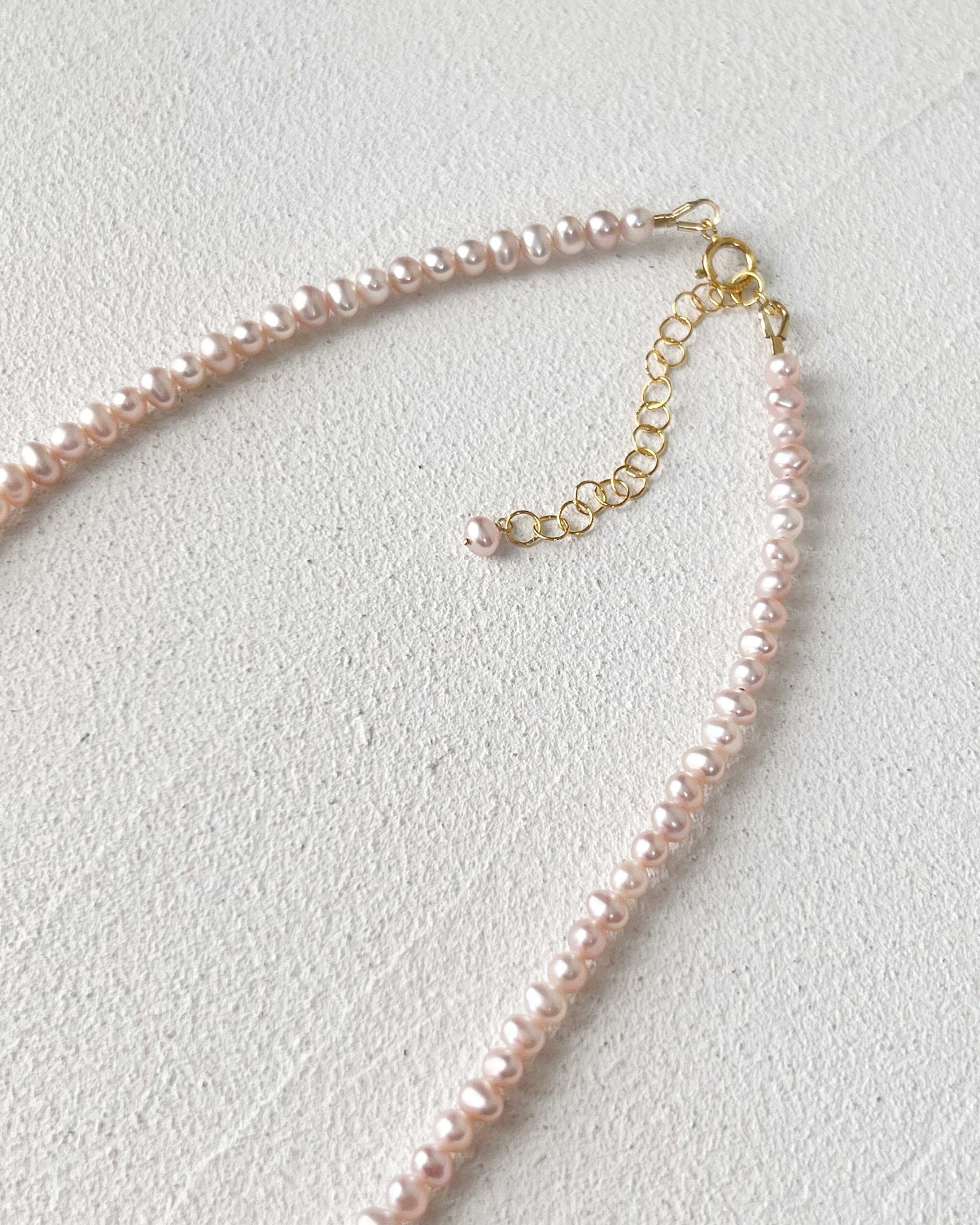 小粒をベースにしながら、さりげなく配置した少し大きめのナチュラルピンクの淡水パールがアクセントです。
