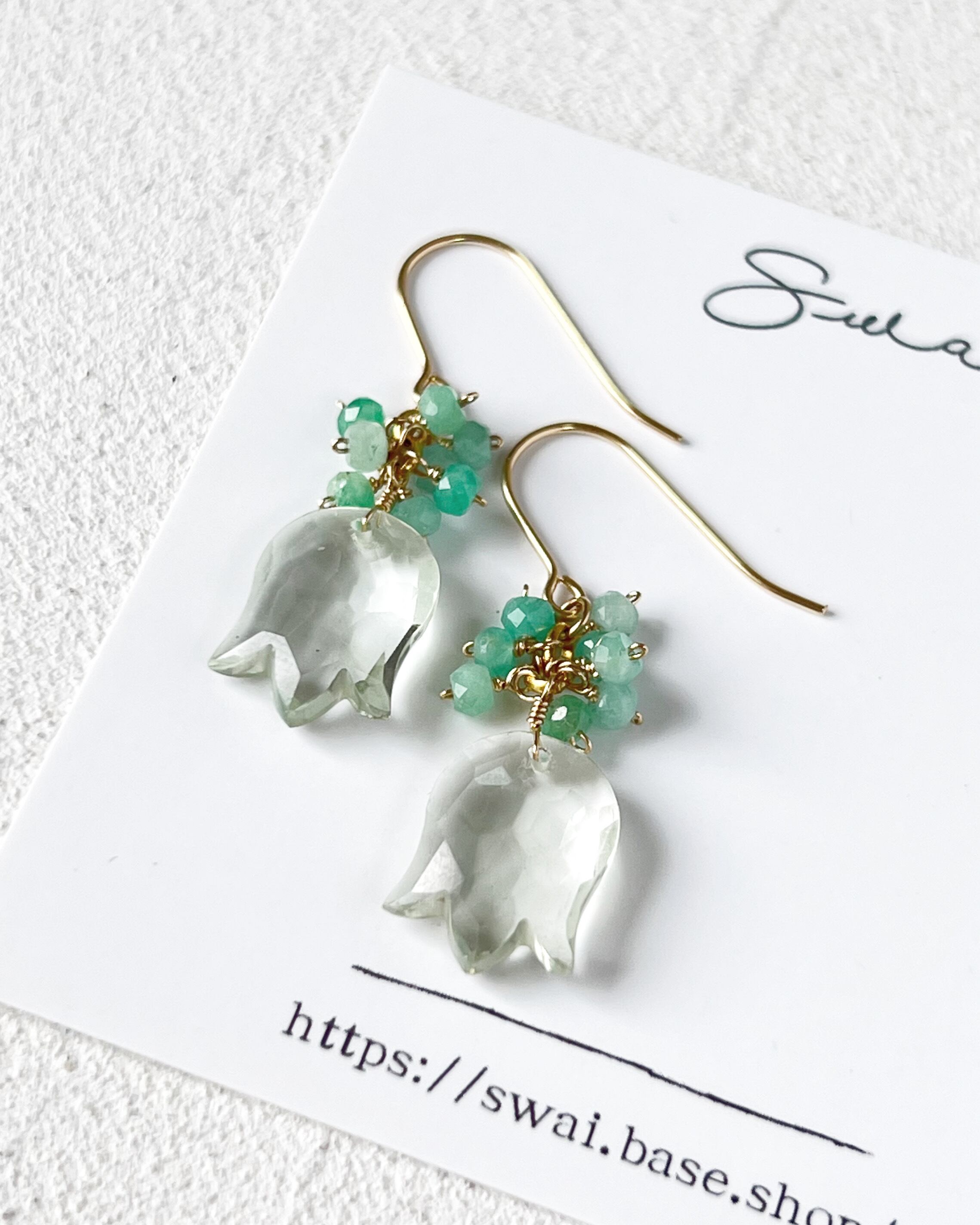 お花のベルフラワー型をしたグリーンアメジストにエメラルドをあしらったショートピアスです。